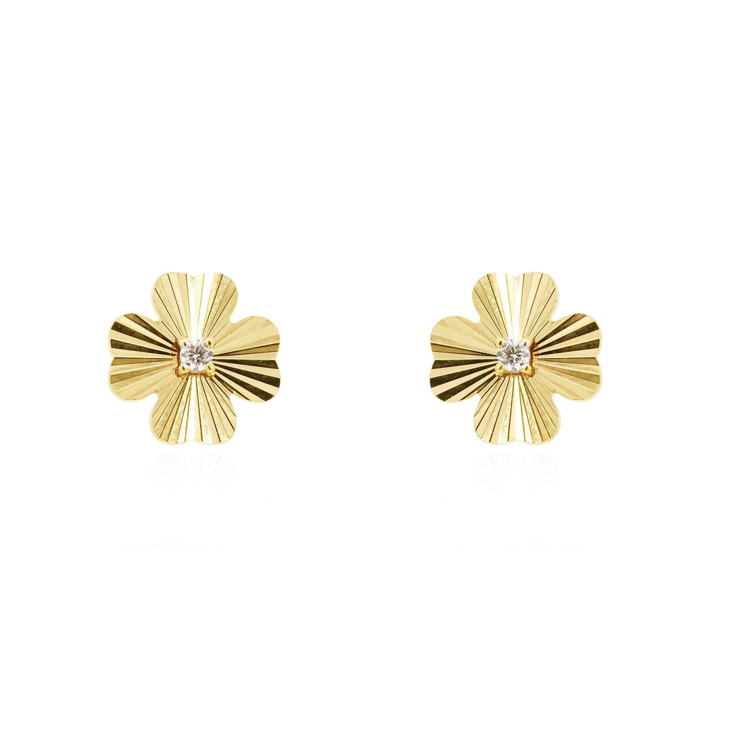 These Fluted Gold Four Leaf Clover Stud Earrings by The Lovery are a chic and meaningful accessory. The four-leaf clover design, accented with round brilliant white diamonds, adds a touch of good luck and elegance to your look. Perfect for any occasion where you want to stand out with sophistication.