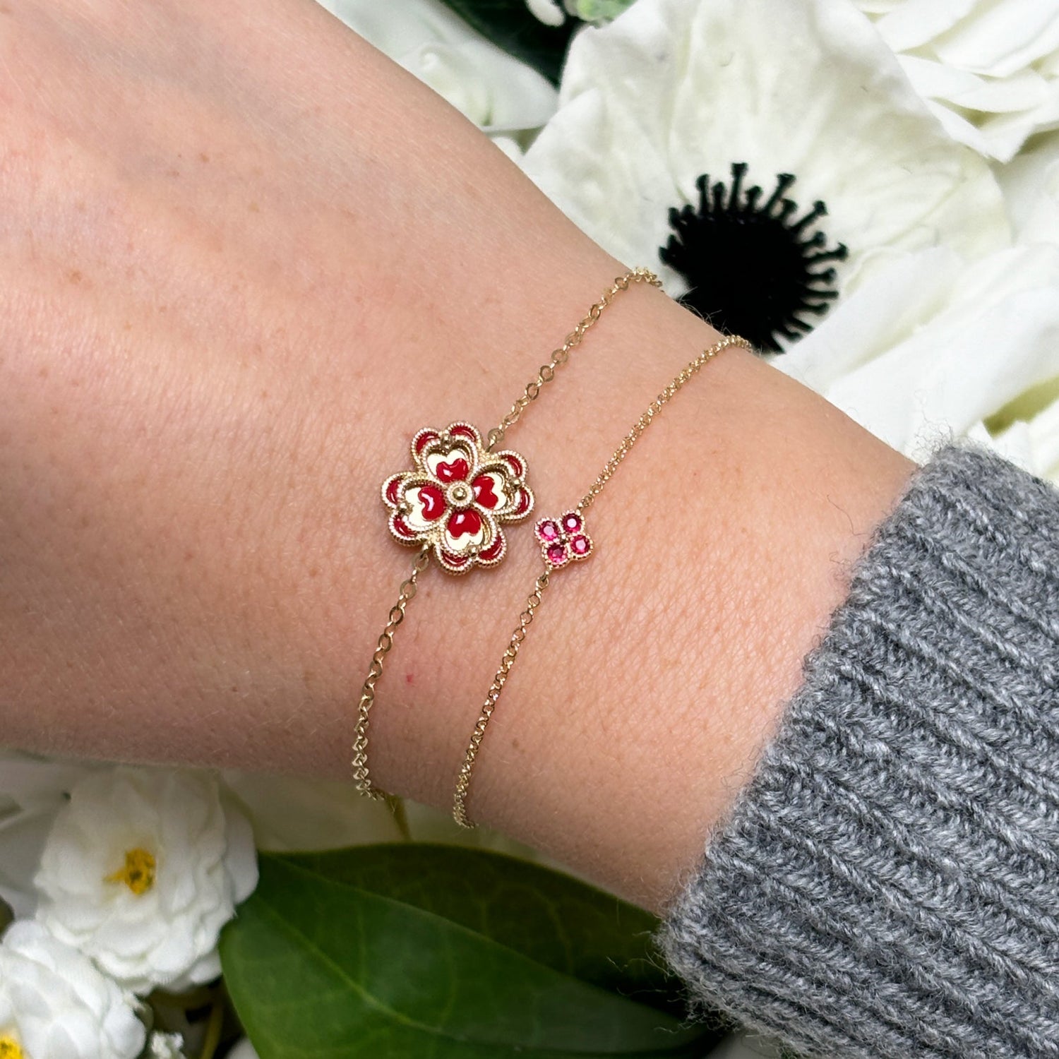 Handcrafted in 14k yellow gold, featuring 1 dark red enamel clover (13mm), adjustable chain length from 6.5 to 7 inches with a lobster clasp.