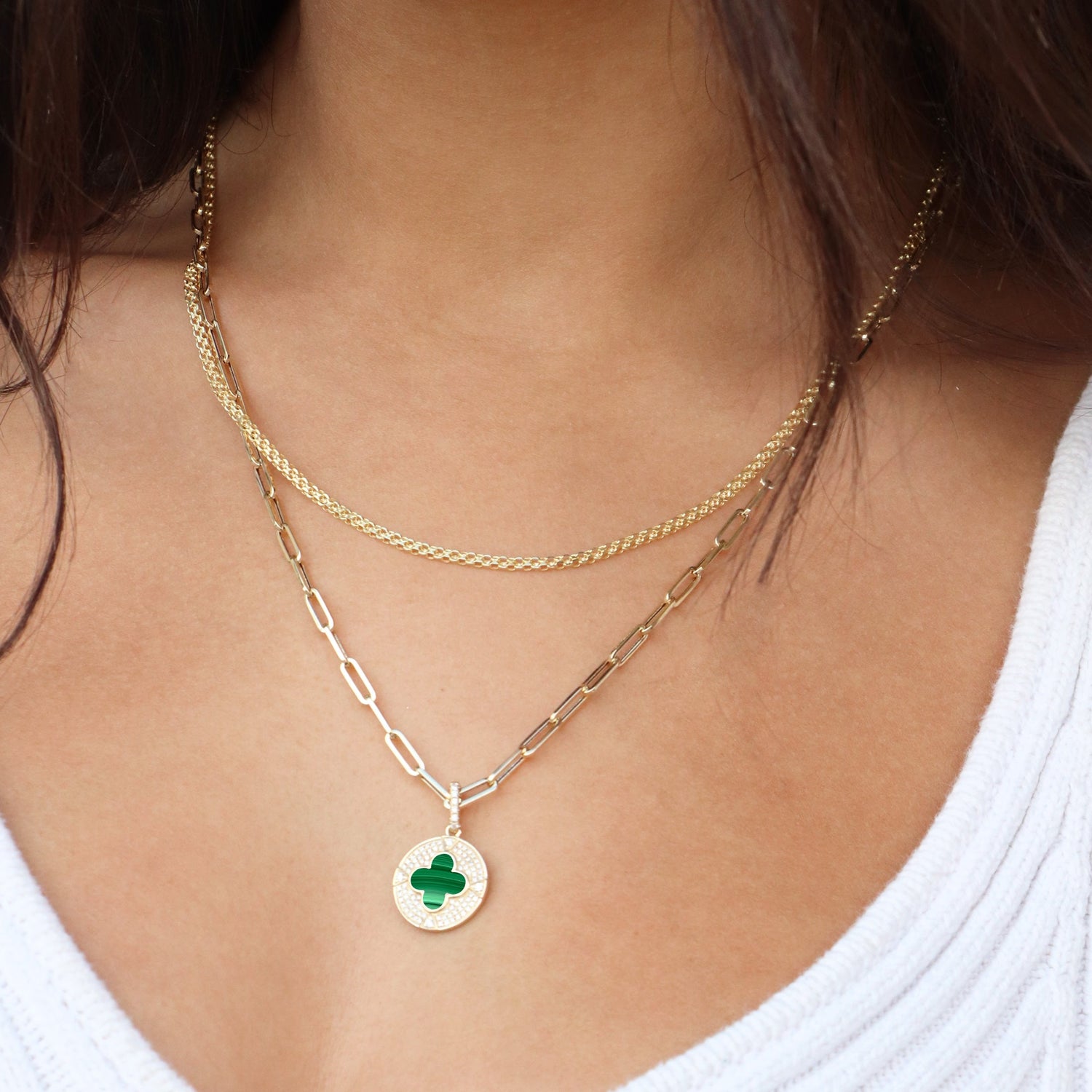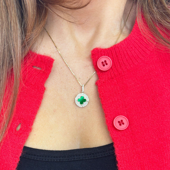 14K yellow gold. Malachite clover (9mm). 0.28 carats of round brilliant white diamonds (H-I color, SI clarity). Charm measures 15mm (0.59 inches). Diamond bale opens to clasp onto link chain.