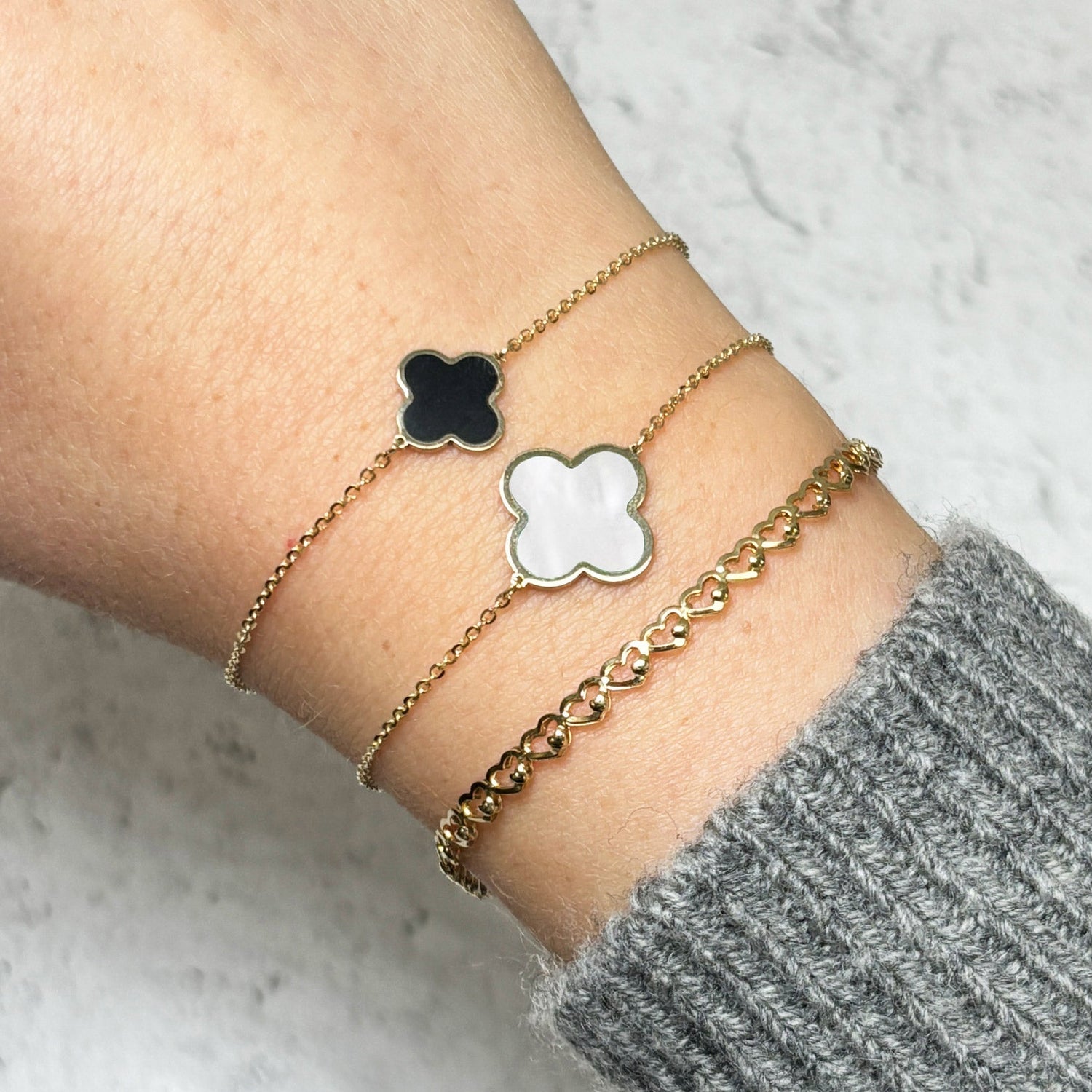 Made with 14K yellow gold and a Mother of Pearl clover measuring 14mm, adjustable chain length of 7 inches with a lobster clasp.