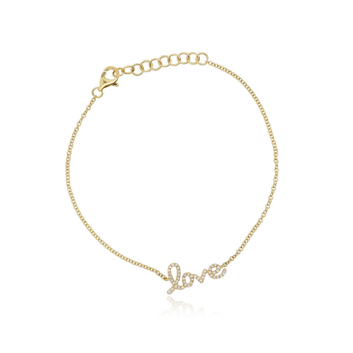 This Diamond Script Love Bracelet by The Lovery is a sparkling and playful piece that brings a touch of romance to your jewelry collection. Crafted from 14K gold, this bracelet features 46 round brilliant white diamonds with a total weight of approximately 0.10 carats. The 'Love' script is elegantly designed, making this bracelet a perfect accessory for adding a delicate yet bold statement to any outfit. Ideal for both everyday wear and special occasions, this piece is adjustable to ensure a comfortable fit, securing with a lobster clasp.