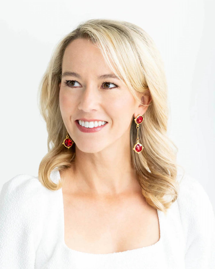 These Women's Coupe Swing Earrings in Red by Susan Shaw: These striking drop earrings feature triple-plated 24K gold and genuine gemstones. Designed to add a luxurious pop of color, they are perfect for evening wear and will elevate any attire. Handcrafted in San Antonio, Texas, these earrings are a beautiful addition to any jewelry collection.