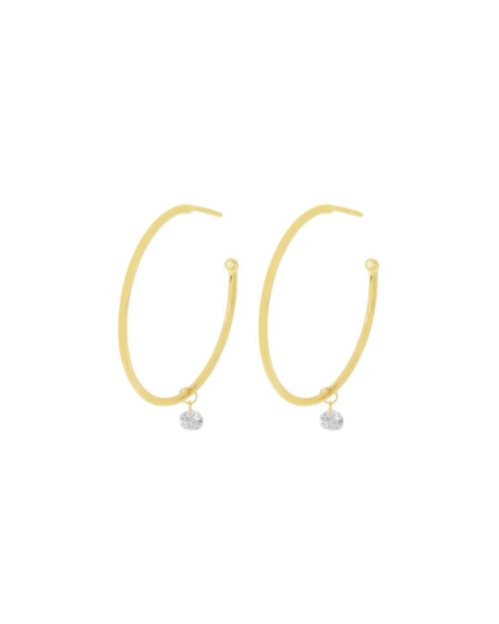 These Women's Dashing Diamond Earrings in Gold by Brevani: These sleek hoop earrings feature diamonds that move freely along the hoop, enhancing their sparkle. Crafted from 14K yellow gold, these earrings are perfect for adding a touch of elegance to any outfit.
