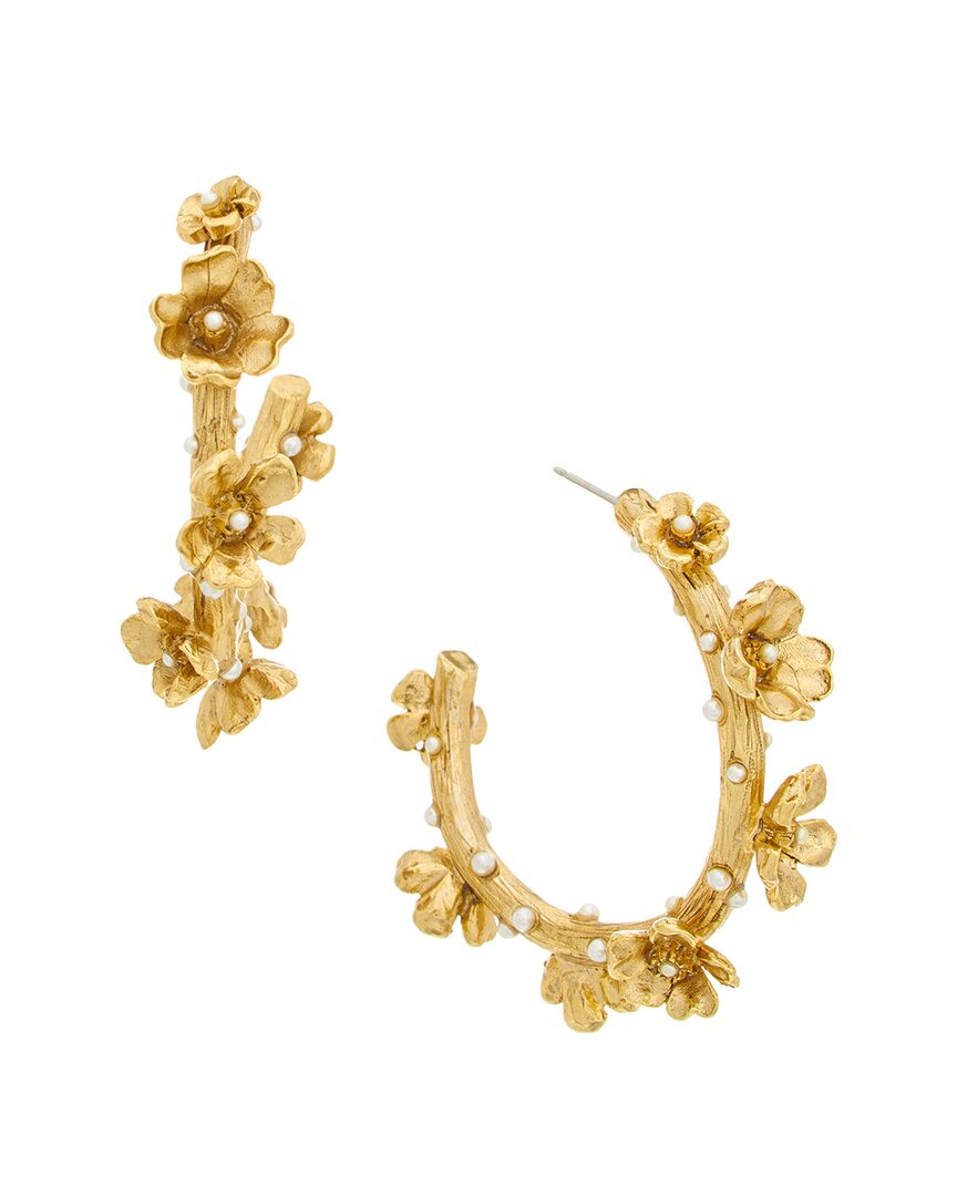 These Oscar de la Renta 14K Pearl Flower Hoops are the ultimate blend of femininity and luxury. Featuring resin pearls set in 14K gold, these hoops drop approximately 1 ¾ inches and offer a delicate floral design that exudes timeless elegance. Perfect for any occasion, these earrings are a beautiful addition to your jewelry collection, offering both sophistication and style with their secure post-back closure.
