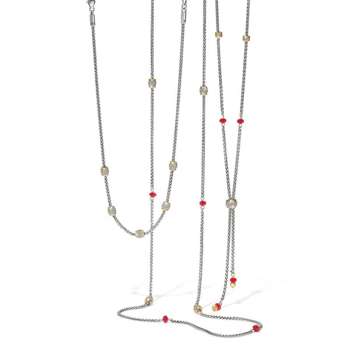 This Meridian Two Tone Long Necklace in Gold-Red by Brighton features hand-cut colorful glass briolettes and fine-quality crystals, making it an exquisite statement piece for any occasion.
