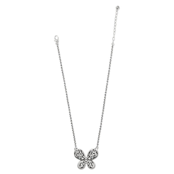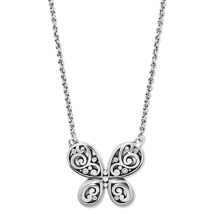This Women's Contempo Butterfly Necklace in Silver by Brighton captures the beauty of vintage jewelry from Taxco, Mexico. With fine crystals and a silver-plated finish, this necklace features intricate scrolls and a pierced-out butterfly design. Its adjustable length of 16-18 inches ensures a perfect fit for any look.