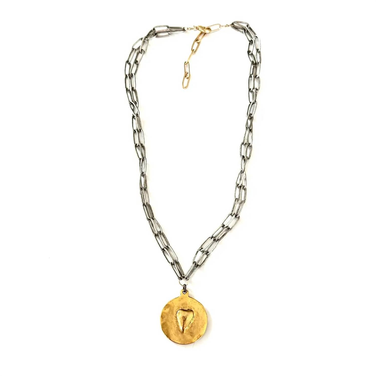 The Women's Reversible Token Necklace by CV Designs is a versatile and elegant piece, combining antique silver with 12k antique gold accents. The reversible design allows you to switch between a cross and heart pendant, giving you flexibility for any occasion. Crafted from high-quality sterling silver, it is a perfect balance of classic charm and modern style, ideal for those who appreciate intricate details and unique design.