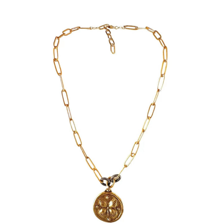 16k gold-plated flat links, 12k antique gold pendant (1.5 inches), Pendant features reversible maple leaf and butterfly designs, Necklace length: 16-18 inches.