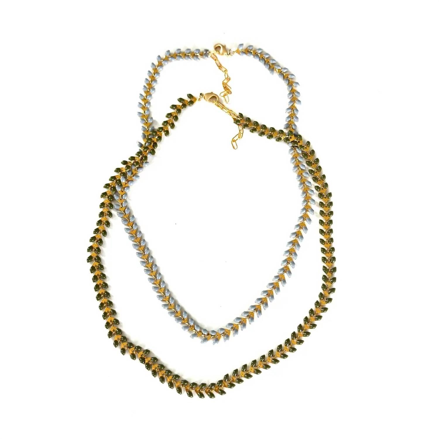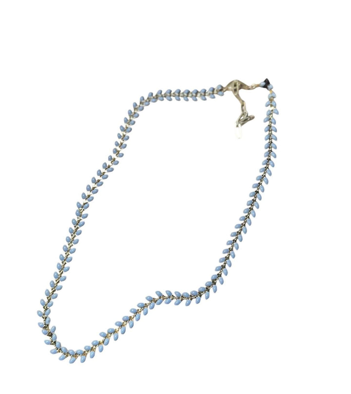 The necklace features enamel and gold-plated links, handcrafted with care. It measures 15-16 1/2 inches in length and is designed for everyday elegance.