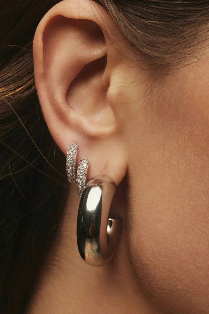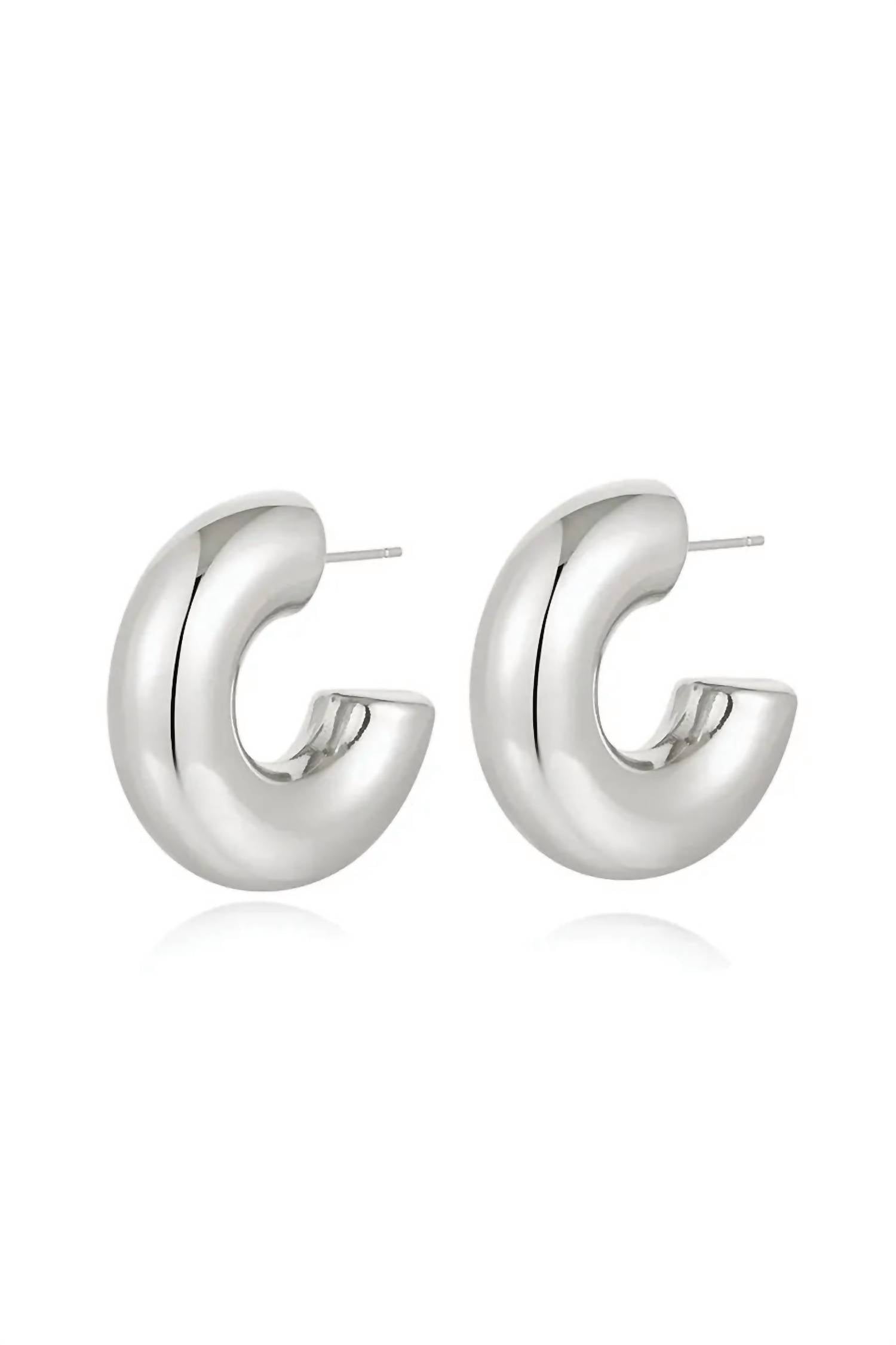 These Women's Noemi Hoops in Silver by Luv Aj: These hypoallergenic silver-plated brass hoops are designed for comfort and style. With a 30mm height and 9mm width, they provide a bold yet wearable look, perfect for day-to-night wear.