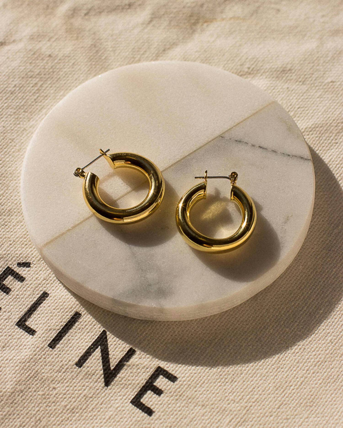 Brass plated with 14K gold or rhodium. Hoop size: 0.9' outside diameter, tubing width 4.3mm. Hypoallergenic surgical steel posts.