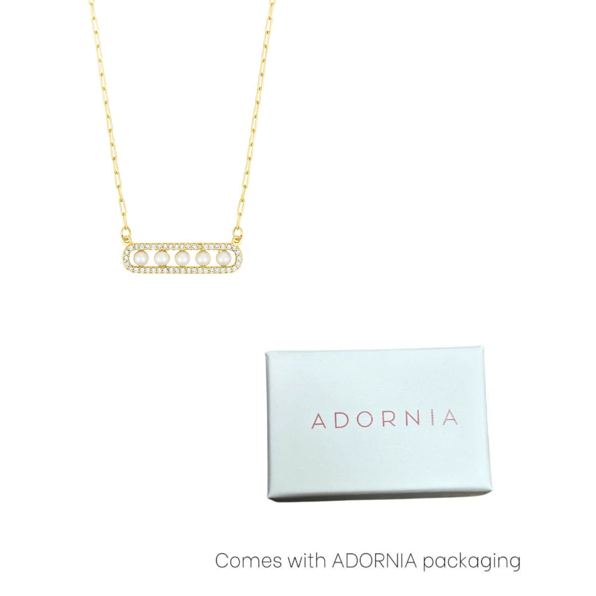 This 14K Gold Plated Pearl Pave Bar Necklace by Adornia is an effortlessly chic piece perfect for everyday wear. The combination of gold-plated brass and faux pearls creates a luxurious yet understated look. The adjustable length ensures it can be styled with various outfits, making it a versatile addition to your jewelry collection.