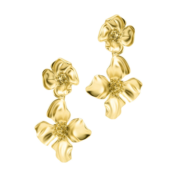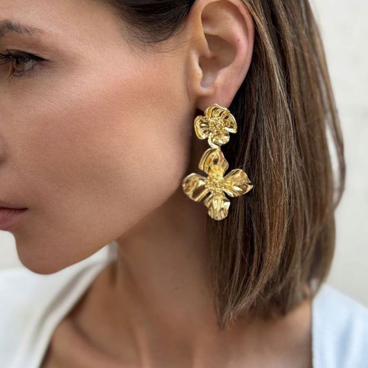 These Gold Plated Flower Drop Earrings by Adornia: These statement earrings feature beautifully crafted gold-plated flowers, with the top flower measuring 20mm x 20mm and the bottom flower at 1.5' x 1.5'. Perfect for adding a touch of luxury and charm to any outfit.