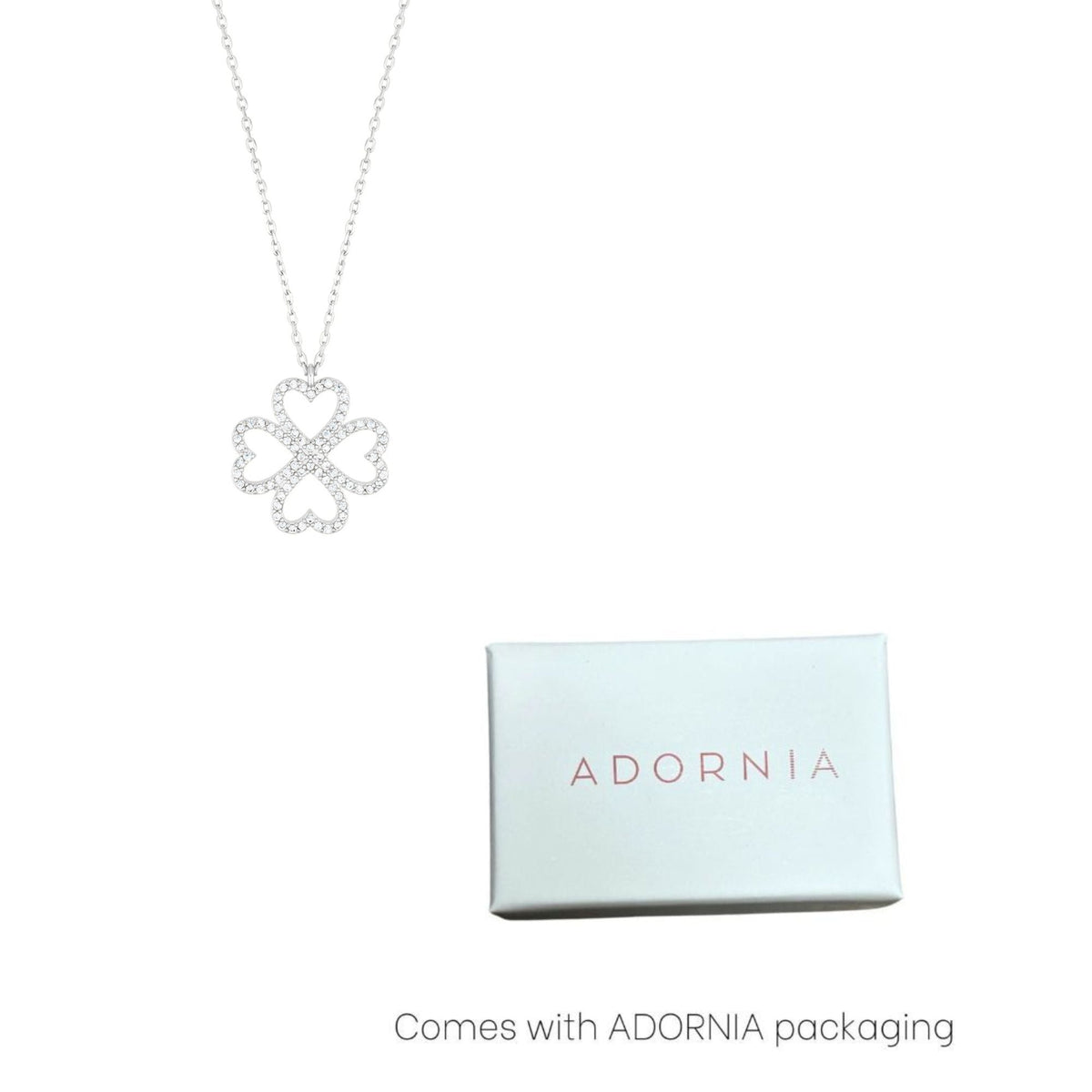 This Silver Plated Heart-shaped Pave Clover Necklace by Adornia offers a beautiful blend of elegance and luxury, with cubic zirconia gems embellishing the heart-shaped clover design. The necklace is perfect for adding sparkle to any outfit.
