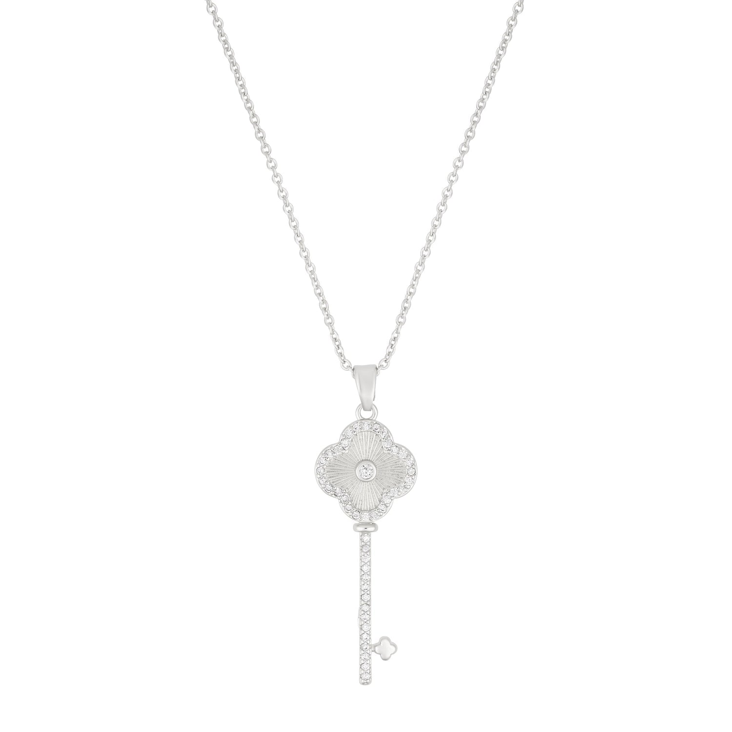 Silver-plated brass, CZ gemstone embellishment, key pendant (1.3' x 0.5'), adjustable 16-20' chain, lobster clasp.