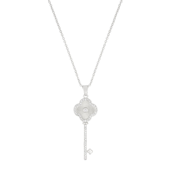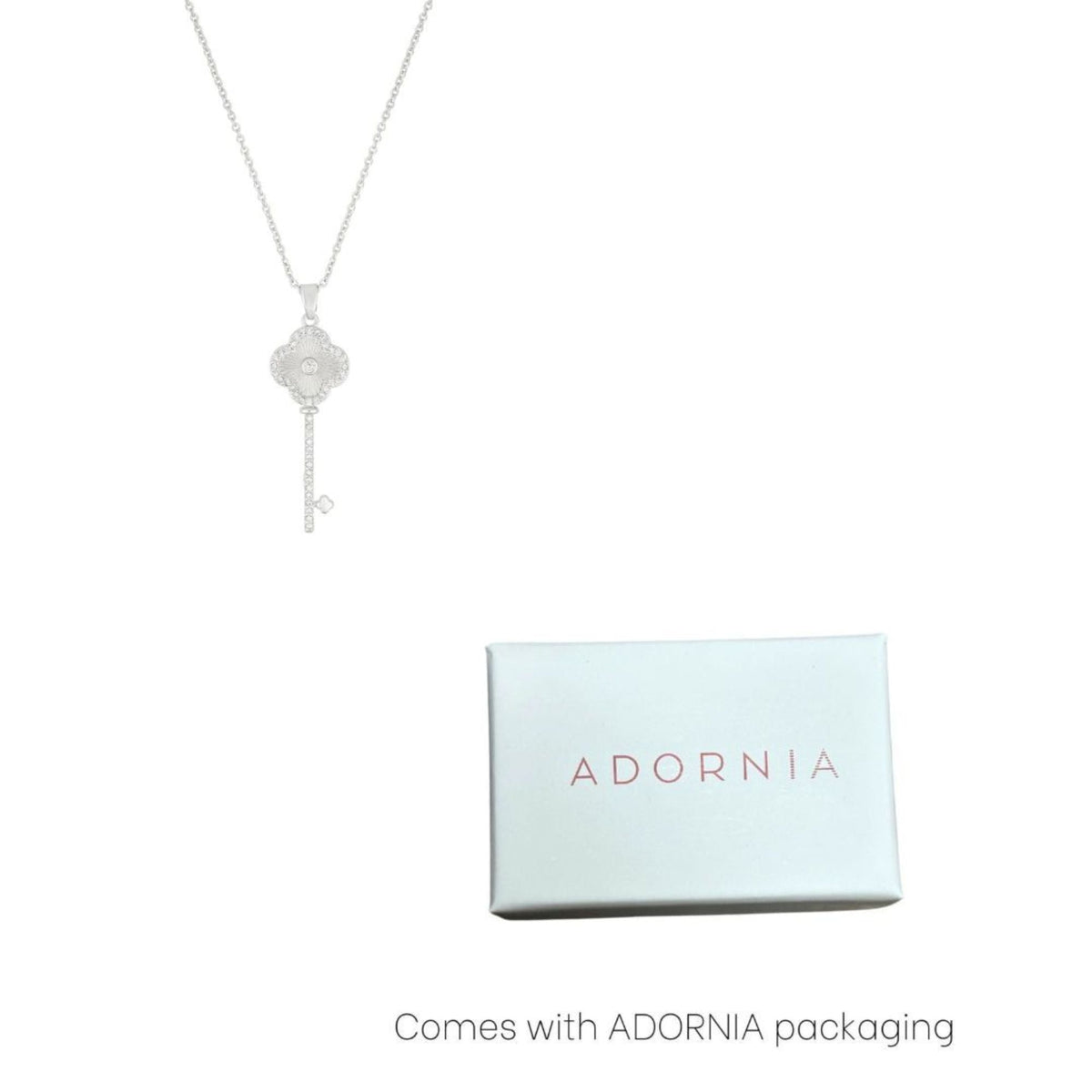 This Silver Plated Pave Clover Key Pendant Necklace by Adornia combines a timeless design with a modern twist. The sterling silver-plated brass is adorned with pave CZ gems, and the key-shaped pendant adds a sophisticated edge. A perfect addition to any jewelry collection, whether you're dressing up or down.