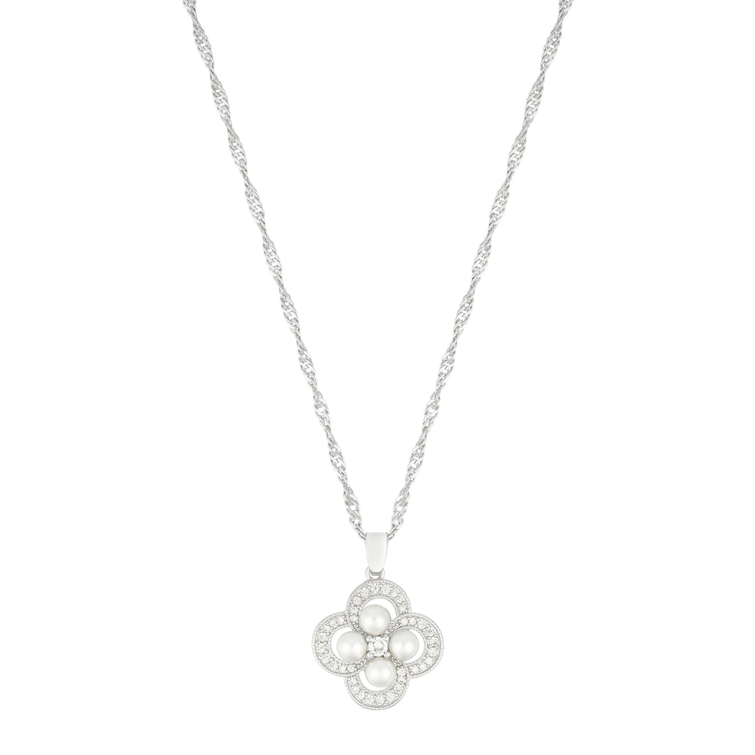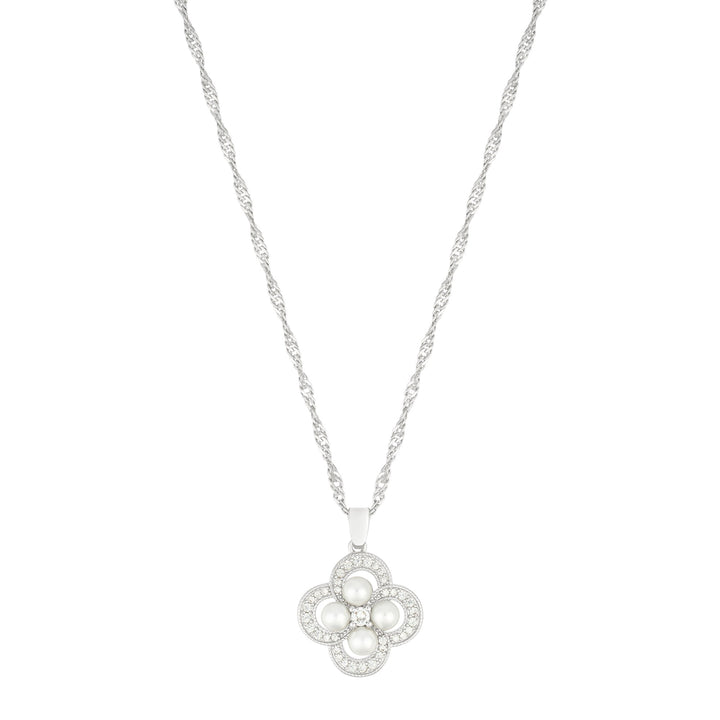 Silver-plated brass, faux pearls (4mm each), clover (12mm x 12mm). Adjustable 15-19 inches, lobster clasp.