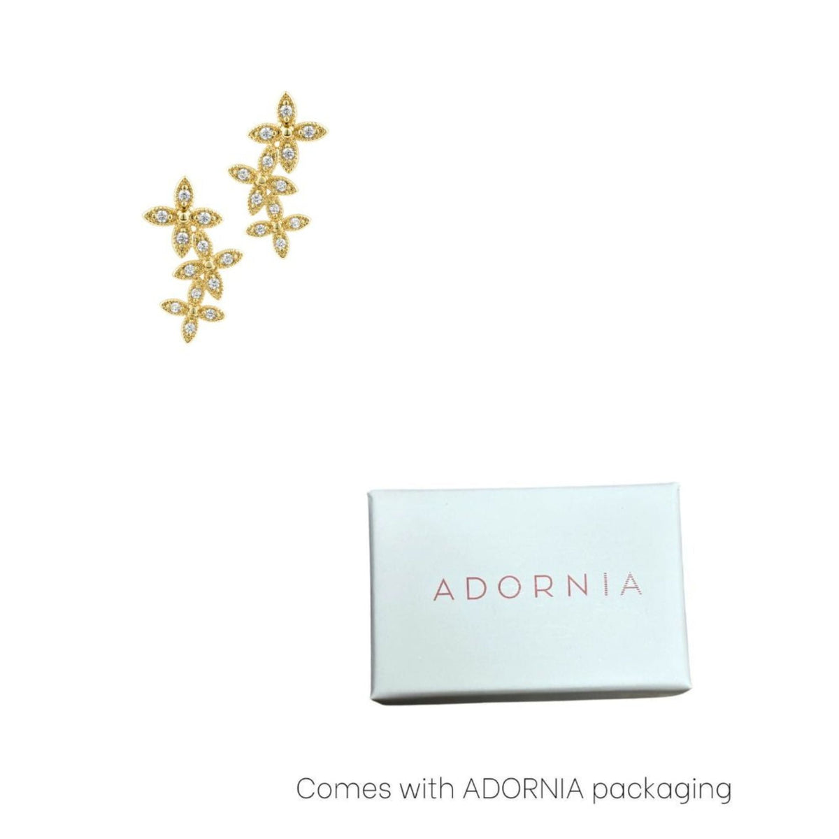 These 14K Gold Plated Curved Flowers Earrings by Adornia: Featuring curved flowers with CZ embellishments, these 14K gold-plated earrings offer a unique design for everyday luxury. With a subtle, elegant touch, these studs are perfect for any occasion.
