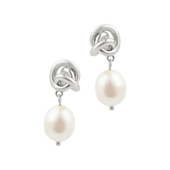 Silver-plated brass with 10mm x 10mm knot design. Freshwater pearl measuring 13mm. Post back closure.