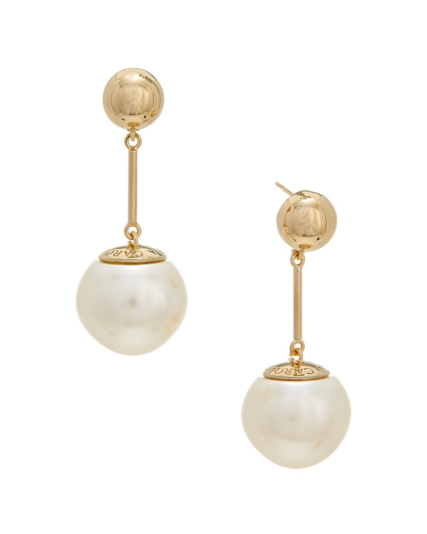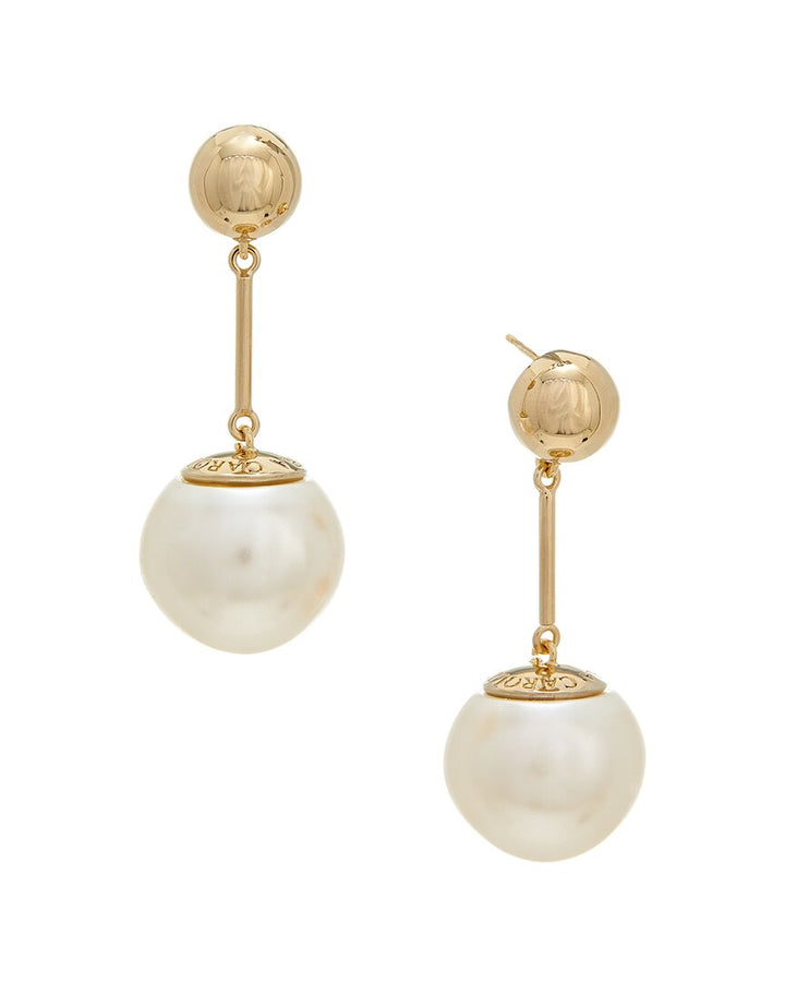 The Carolina Herrera Pearl Drop Earrings exude luxury and refinement. Crafted with a blend of metal and plastic, these 2.5-inch drop earrings are designed to make a statement. Their versatile design complements both day and evening wear, adding an elegant touch to any outfit.