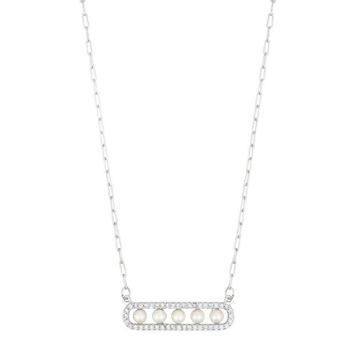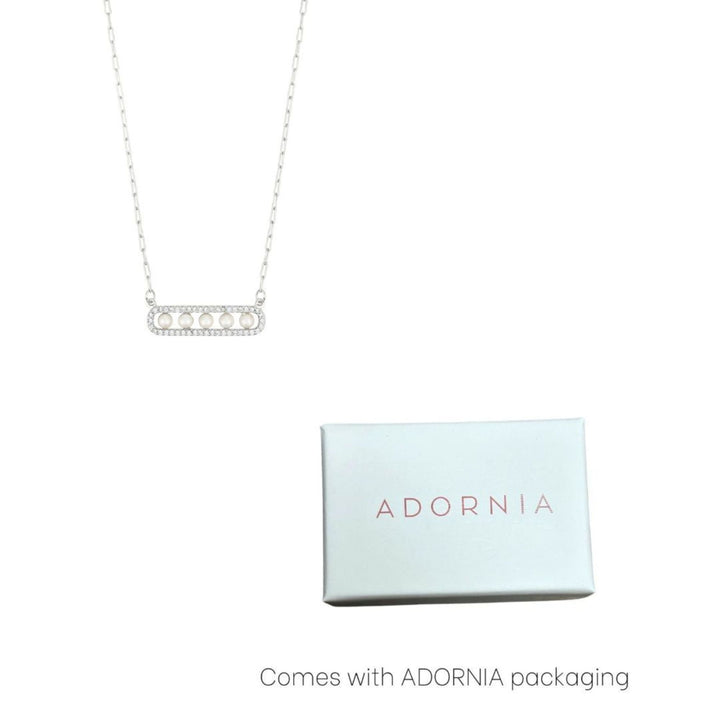This Silver Plated Pearl Pave Bar Necklace by Adornia is a modern twist on a classic design. The faux pearls, set in silver-plated brass, create a delicate and elegant statement. The necklace is perfect for both daily wear and special occasions, and the adjustable length adds versatility.
