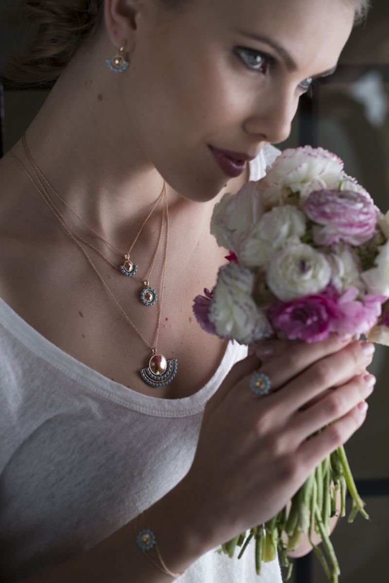 The sun is shining on you. Designed with inspiration by the sunrise, this collection contains sun figures in different sizes blended with 14k rose gold, sapphire and turquoise. Sapphire and turquoise stoned parts symbolize the sea.