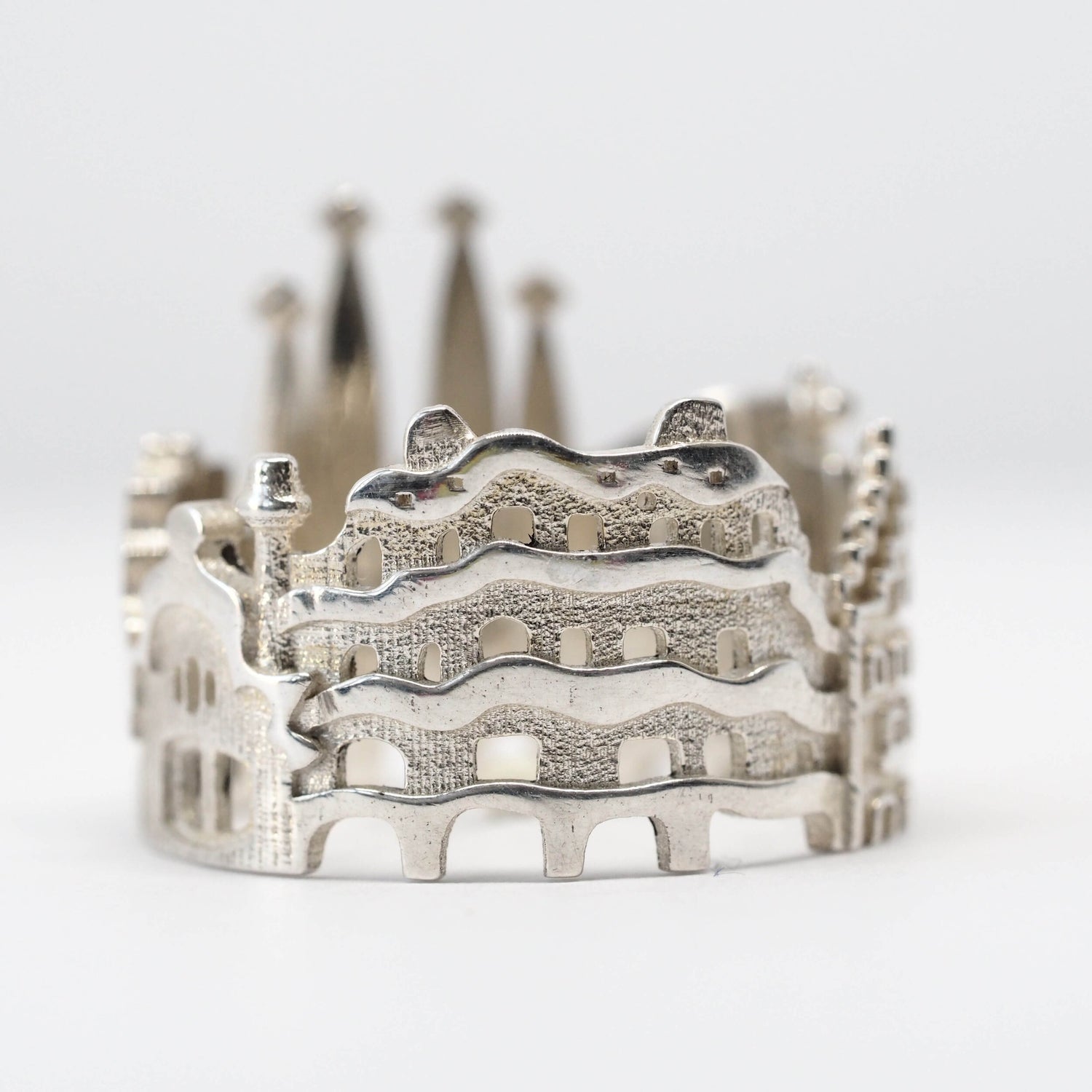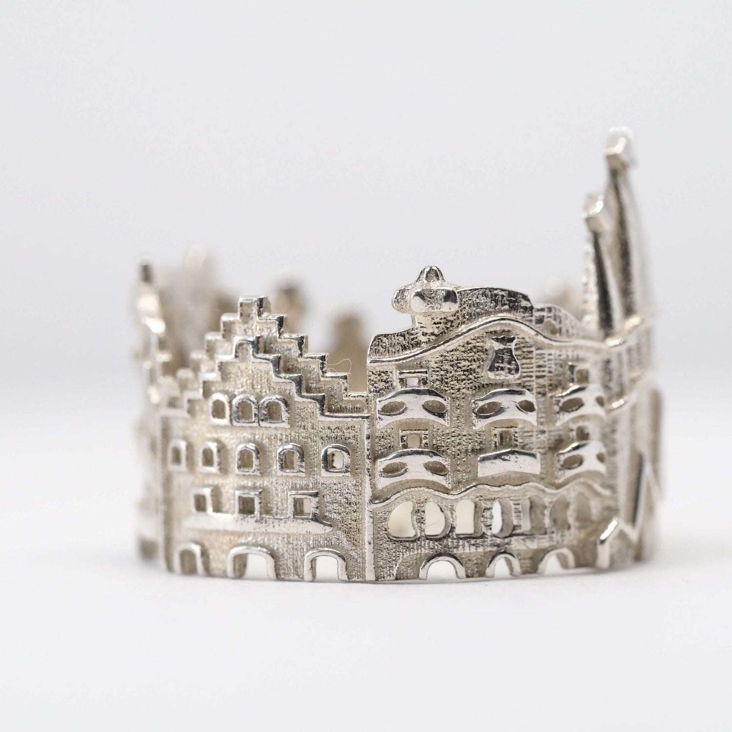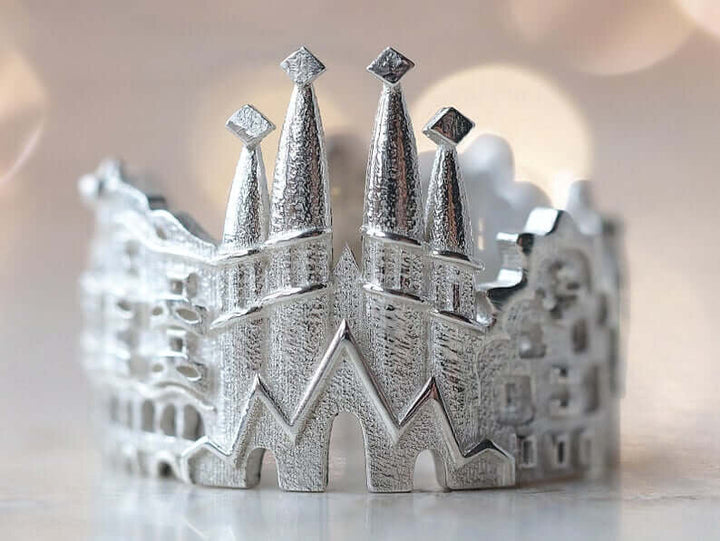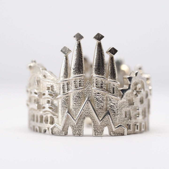 The Barcelona Cityscape Ring is highly detailed and features many of Antoni GaudÃ's masterpieces: Casa Batlló, Casa Amatller, La Sagrada FamÃlia, Casa Calvet, Casa Milà (La Pedrera) and in larger sizes cookie houses from Park Güell appear as well.