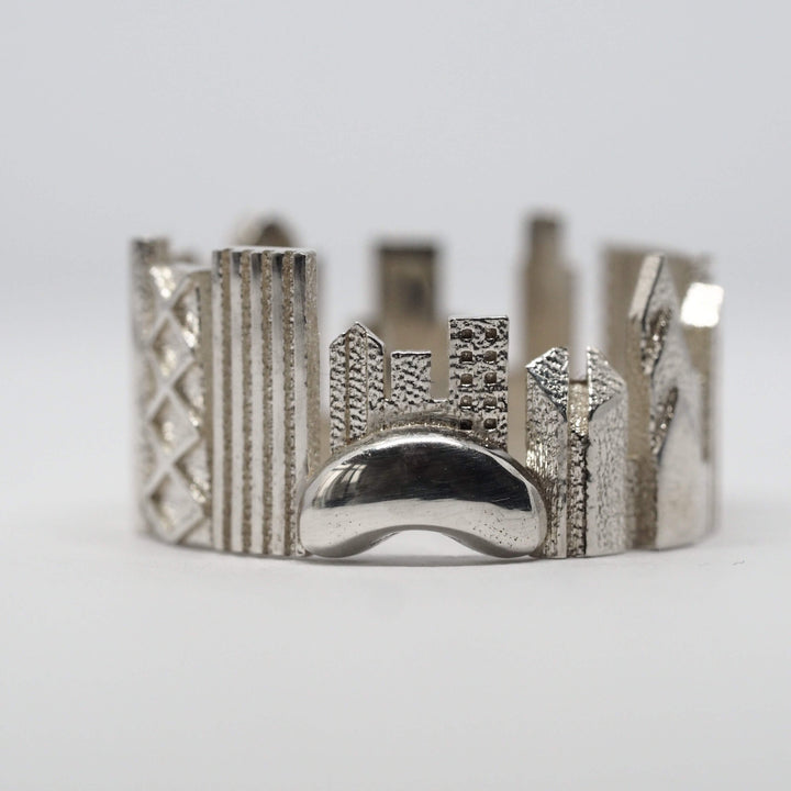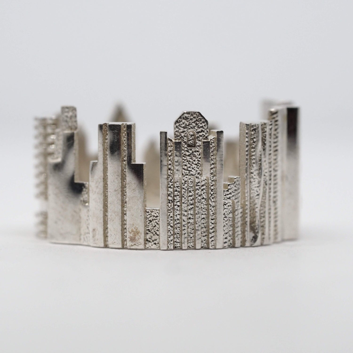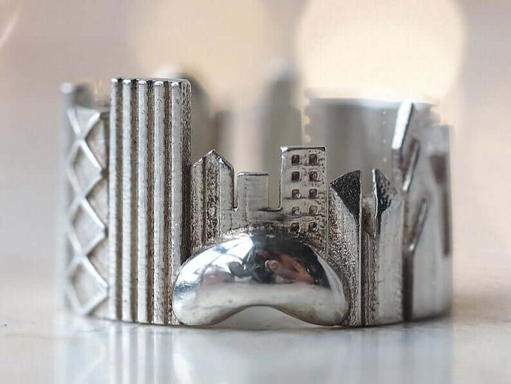 The Chicago Cityscape Ring is highly detailed and features Hancock Center, Smurfit-Stone Building, Marina City, Sears Tower, Tribune Tower, Aqua Tower, Lake Points Tower and of course The Chicago Bean in Millennium Park.