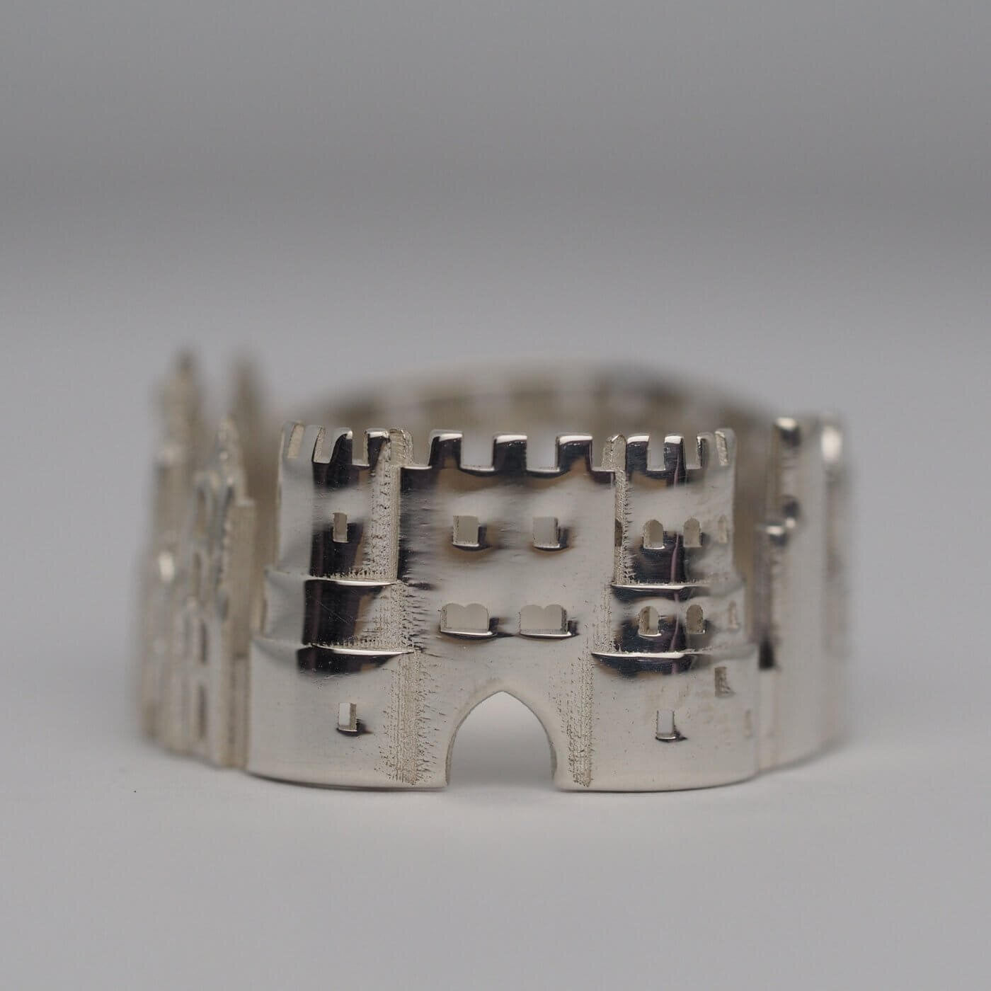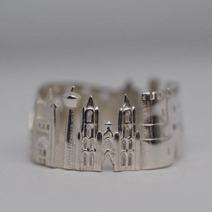 The Cologne Cityscape Ring is highly detailed and features Kolner Dom (Cologne Cathedral), Hahnen Torburg (Hahnen Gate), Kolonius Fernsehturm (Colonius Broadcast Tower), St. Martin Church with iconic houses, Mediapark Tower and Hohenzollen Bridge.