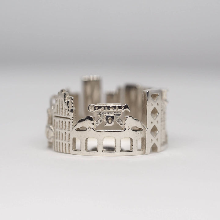 The Detroit Cityscape Ring is highly detailed and features Renaissance Center, The Spirit of Detroit Statue, "Transcending" Monument, "Fist" - Monument to Joe Louis, Ally Building (One Detroit Center), Comerica Park, Ambassador Bridge to Canada and Ola's favorite - Old Train Station.