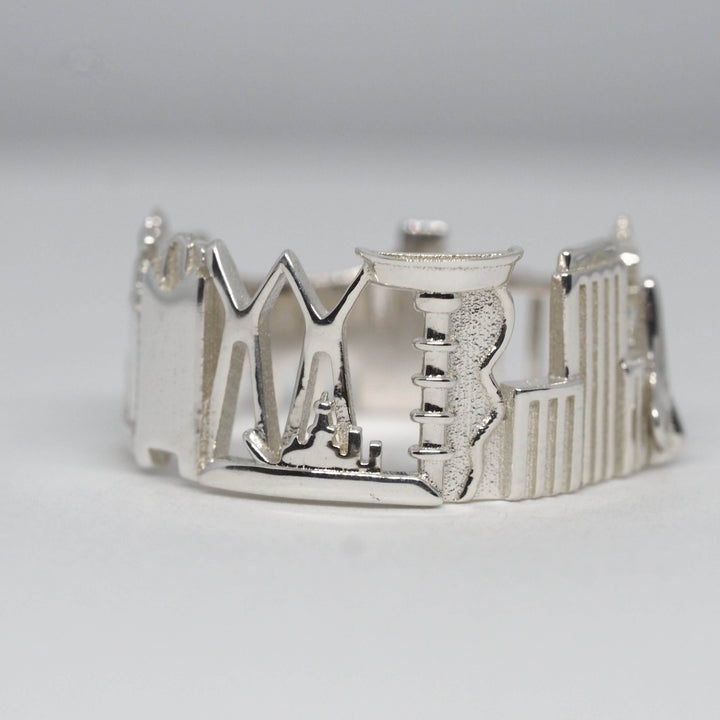 The Houston Cityscape Ring is highly detailed and features Water Wall Building, famous skyscrapers, City Hall, Museum District and Sam Houston Ship Channel Bridge with battleship and a Space Ship as a symbol of world famous Space Center.