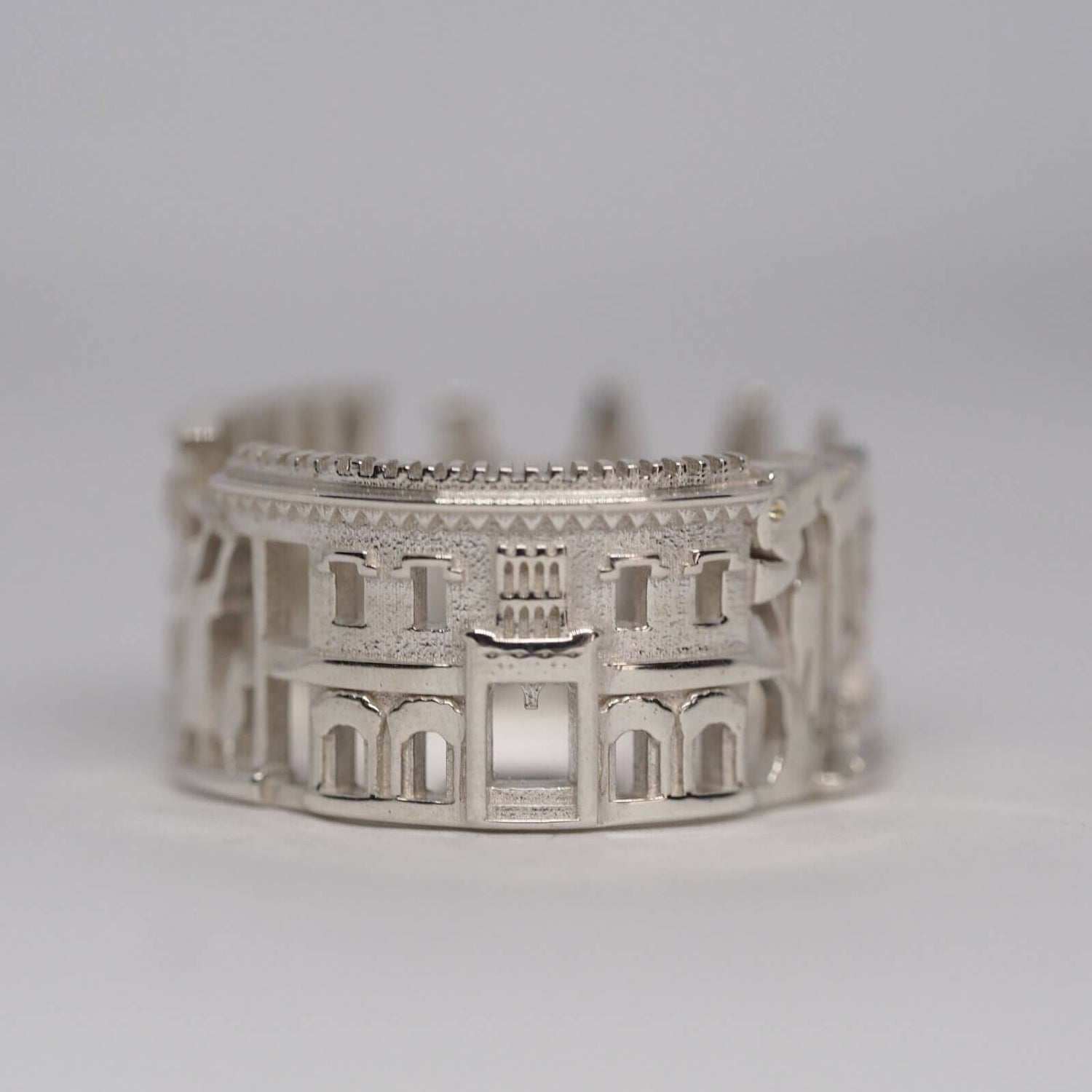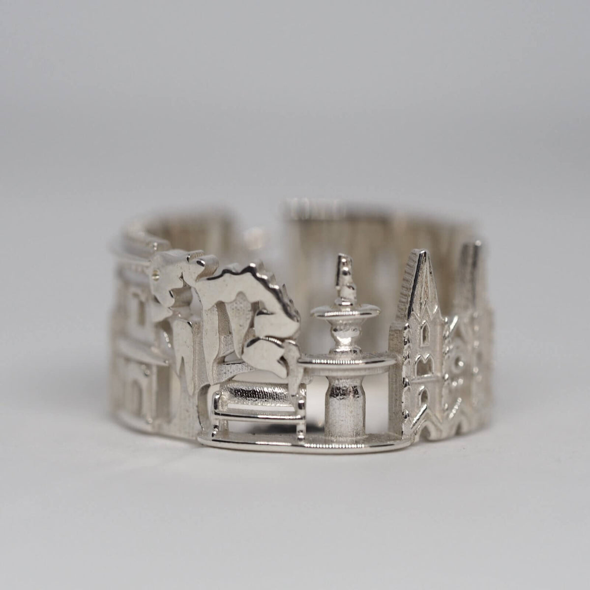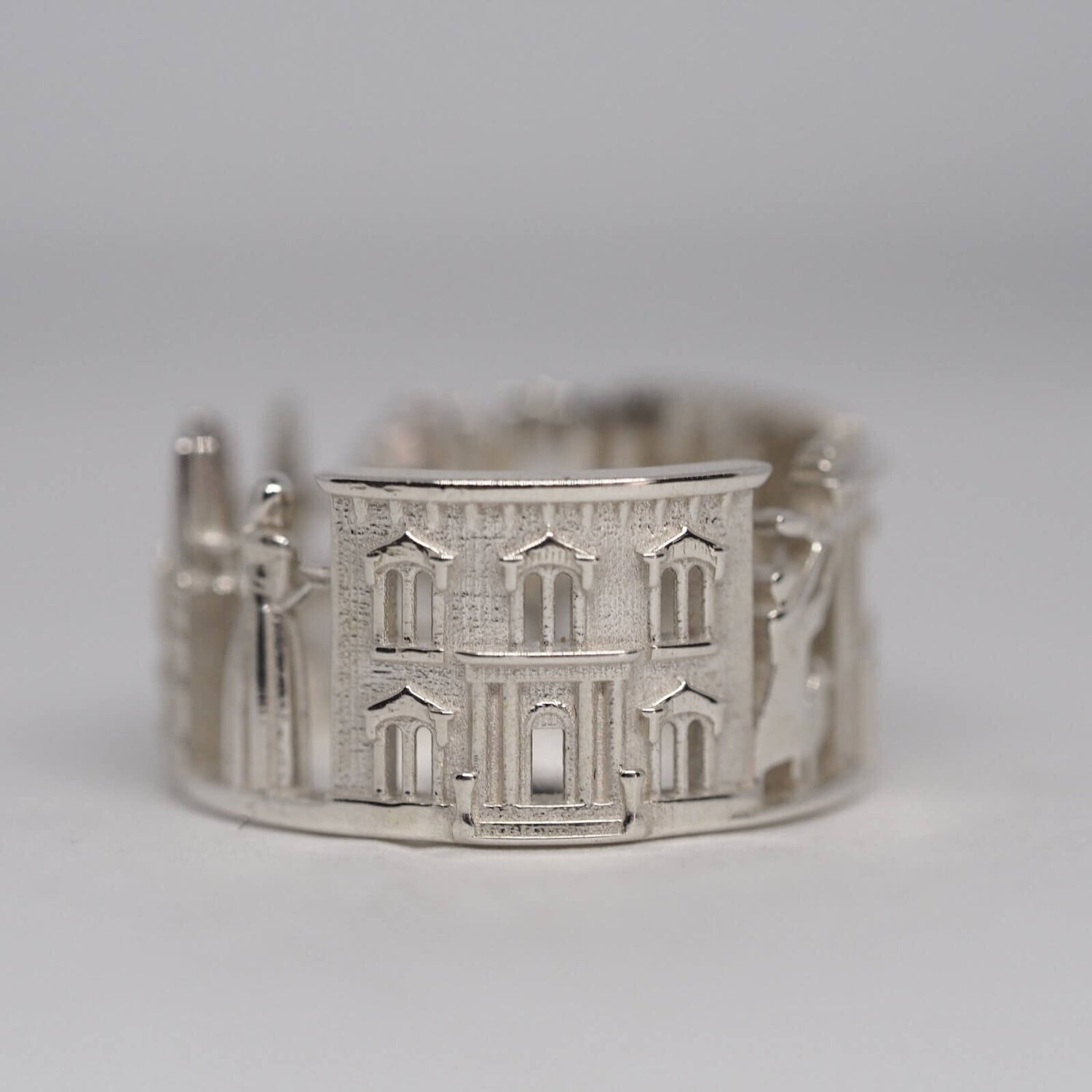The Savannah Cityscape Ring is highly detailed and features Bird Girl Fountain, William Mercer House, Waiving Girl Statue, Green Meldrim House, Forsyth Park Fountain and St. John Baptist Cathedral.