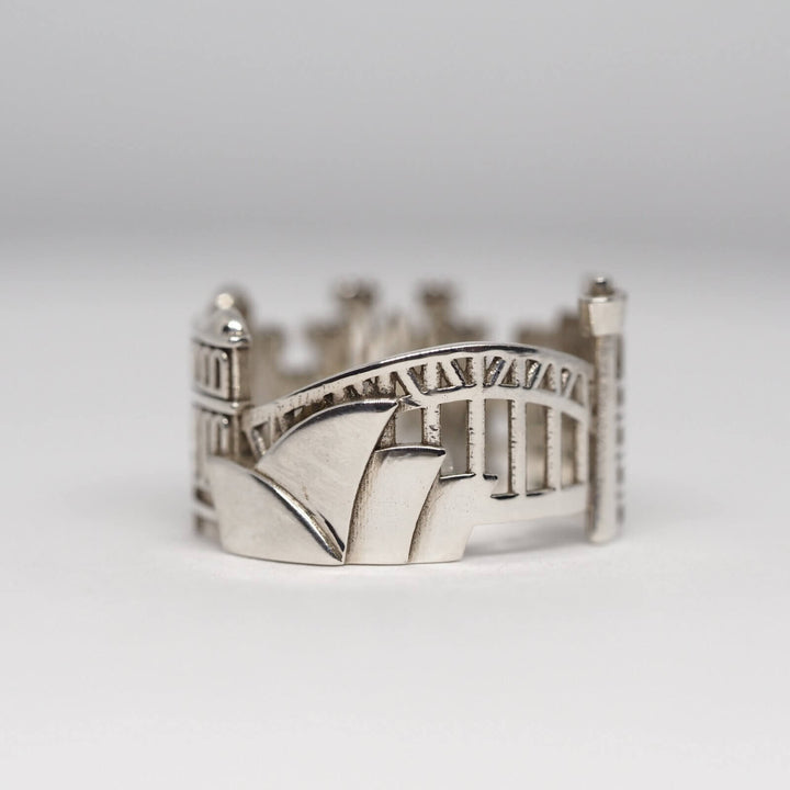 The Sydney Cityscape Ring is highly detailed and features The Bay Bridge, TV tower, Opera House, Government House, Queen Victoria Building and St. Mary's Cathedral.