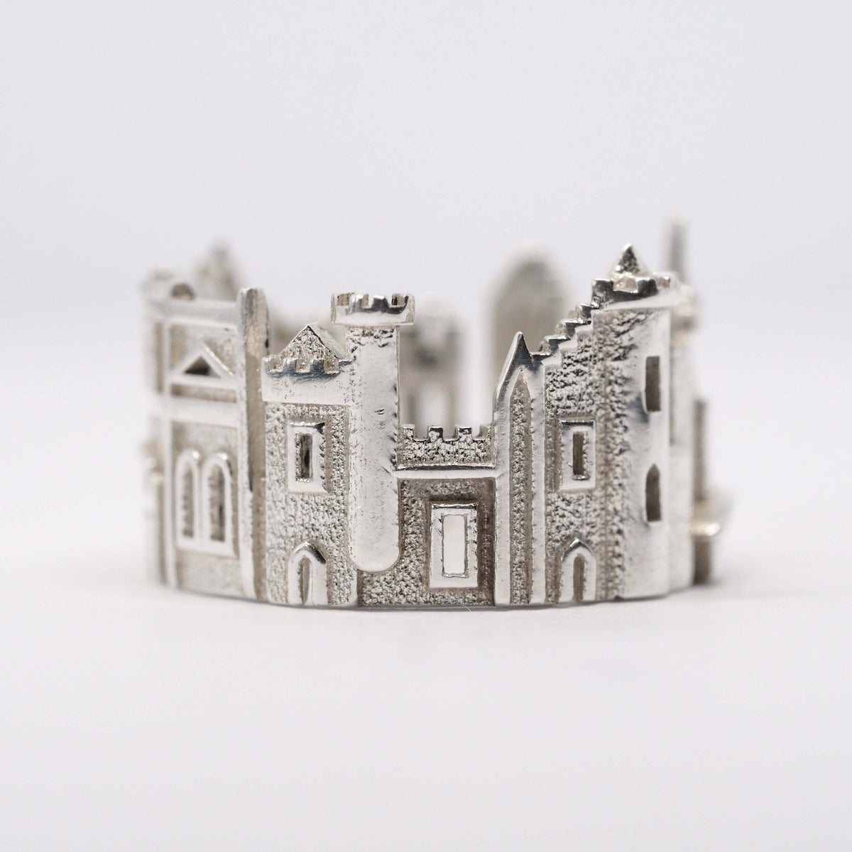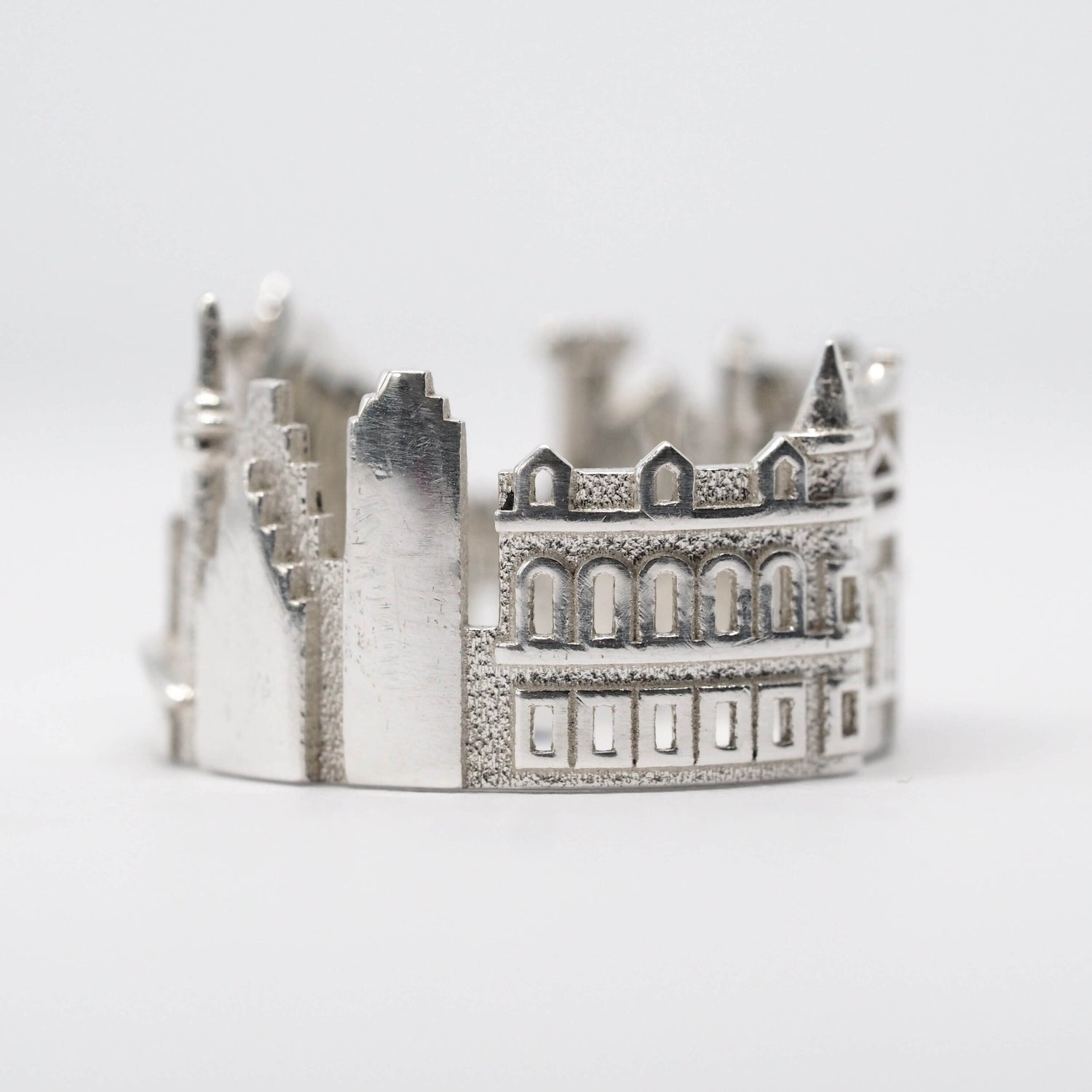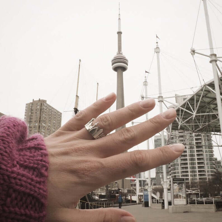 The Toronto Cityscape Ring is highly detailed and features Flatiron building, Hockey Hall of Fame, Casa Loma, CN Tower with Rogers Center and some recognizable skyscrapers including Trust Tower.