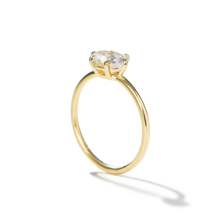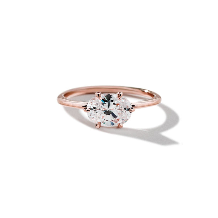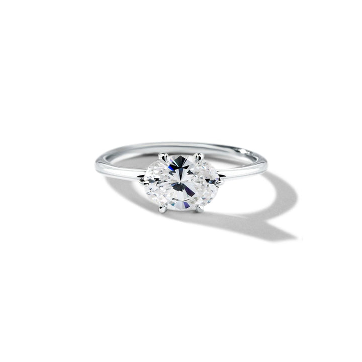 Bold and beautiful. The Mia modern east-west solitaire engagement ring setting is not only unique, it is down right bold. The brilliant oval diamond option is captured by six unique, clawed prongs. Available in your choice of carat weight of the diamond in either sustainably lab created diamonds or ethically mined diamonds.
