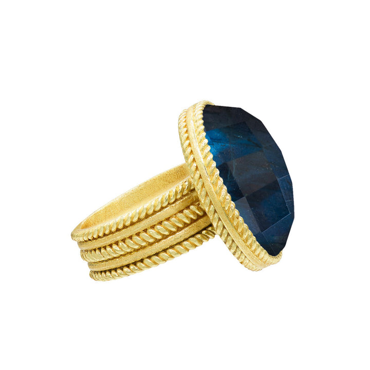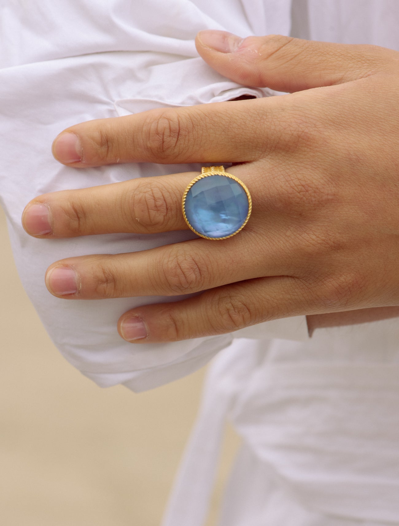 These Colette Rings by Marcia Moran are the perfect statement piece. Crafted with 18k gold plating, the ring features a large circle stone in the center, accompanied by a textured side and band, adding an extra dimension to its bold and sophisticated design.