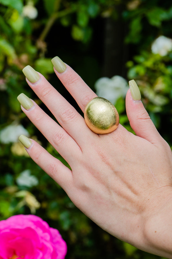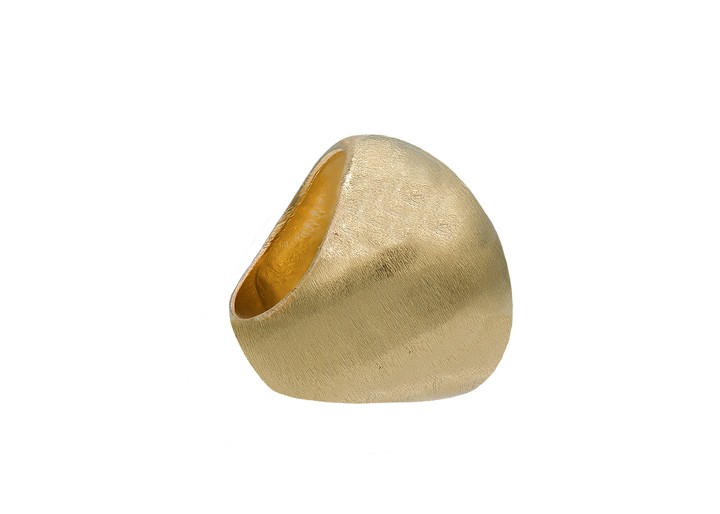 This Lunabelle Ring by Marcia Moran offers a sleek, bold design with its 18k brushed gold dome structure. The 1.5-inch height makes it an eye-catching statement piece that adds luxury and modernity to any look.
