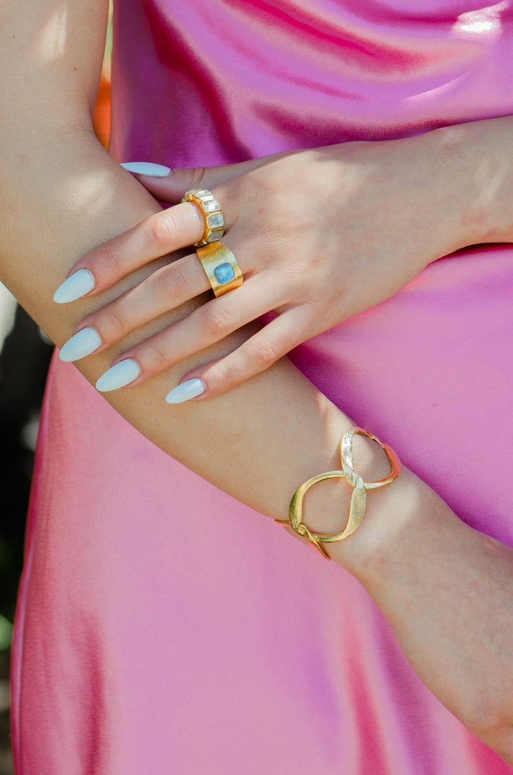 Handcrafted in 18k gold plating over brass with a center stone. Each piece is unique due to the natural semi-precious stones.