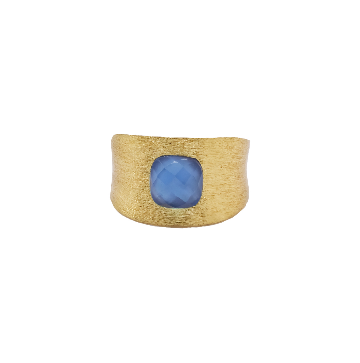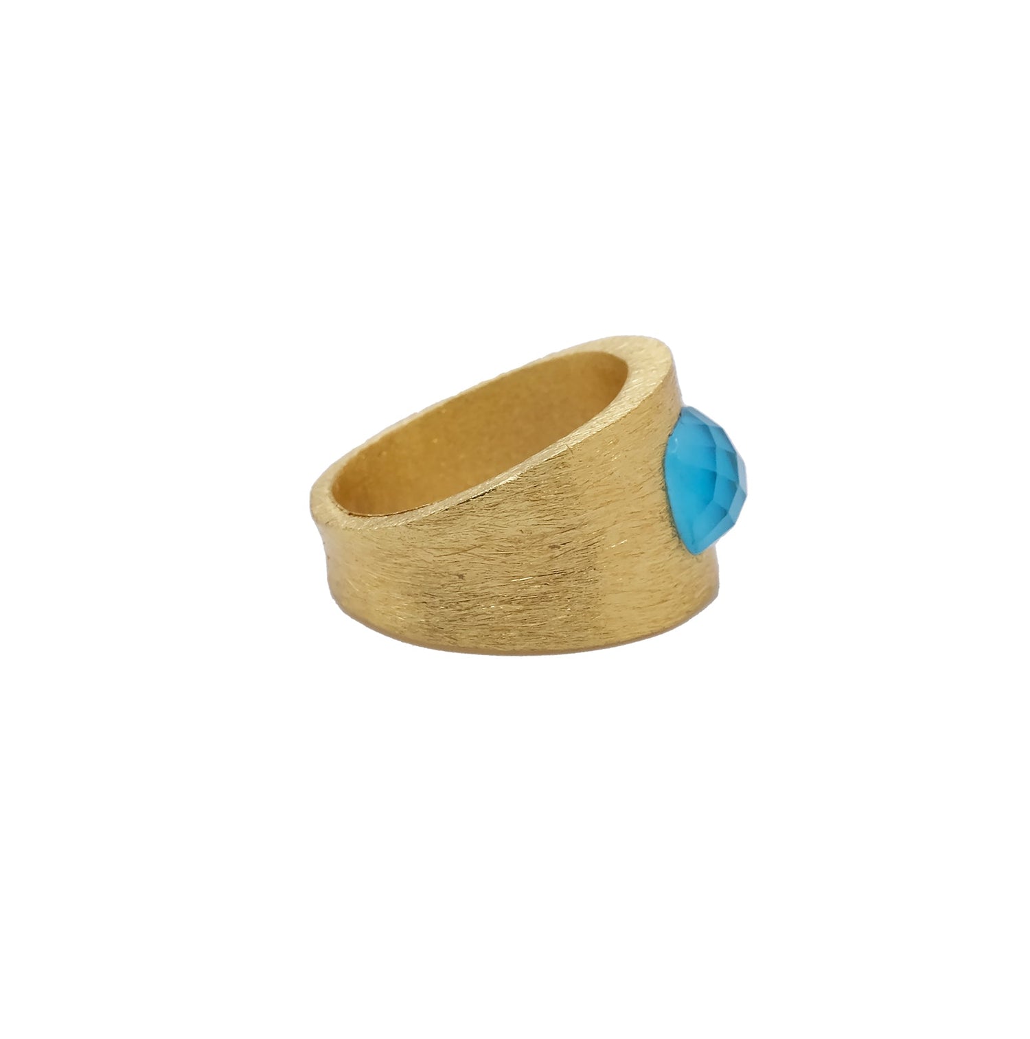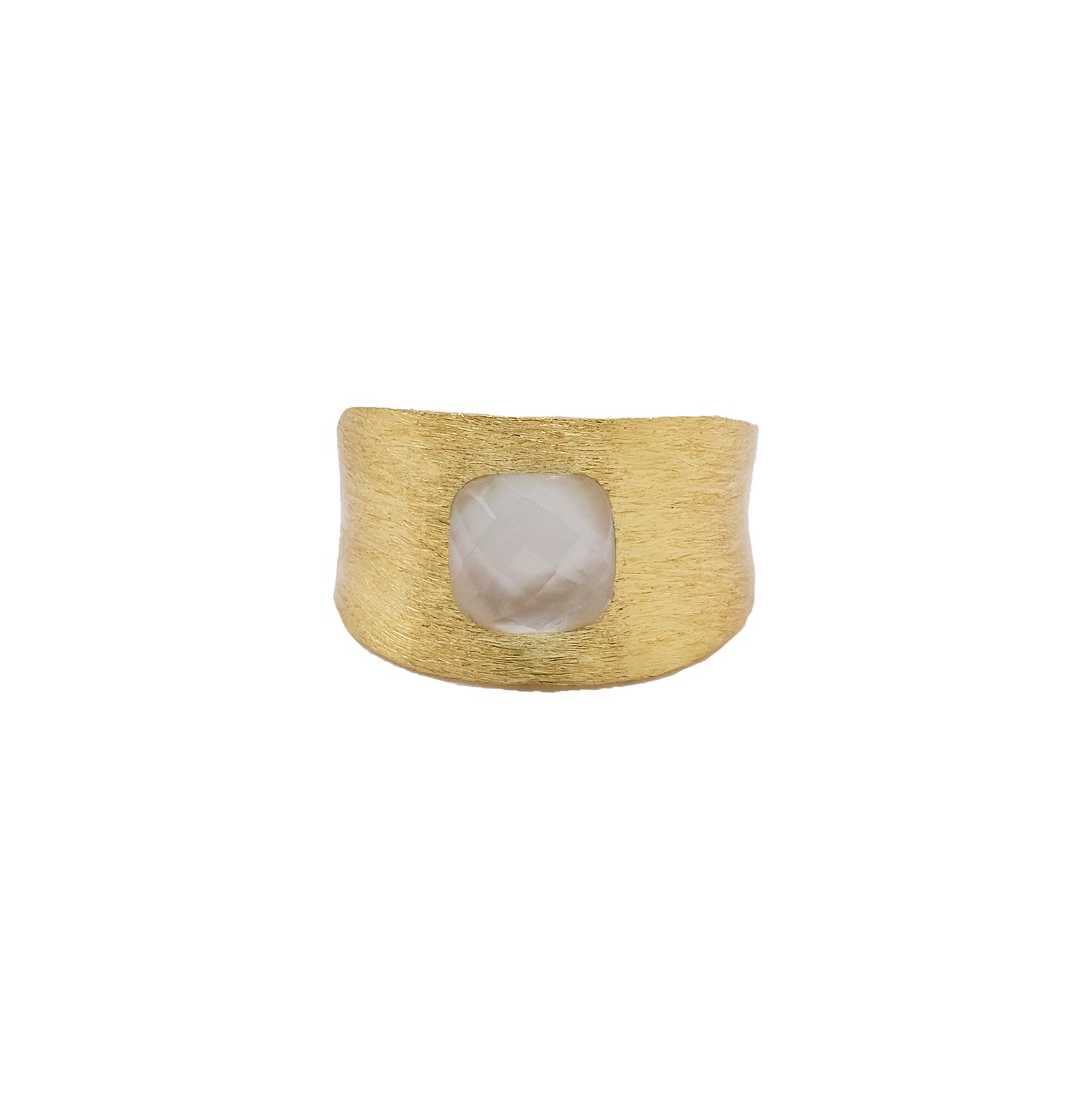 The Benita Ring by Marcia Moran offers a brushed finish with an elegant center stone. The 18k gold plating over brass adds a luxurious touch to this versatile design. Handmade in Brazil, each piece is unique due to the natural semi-precious stones.