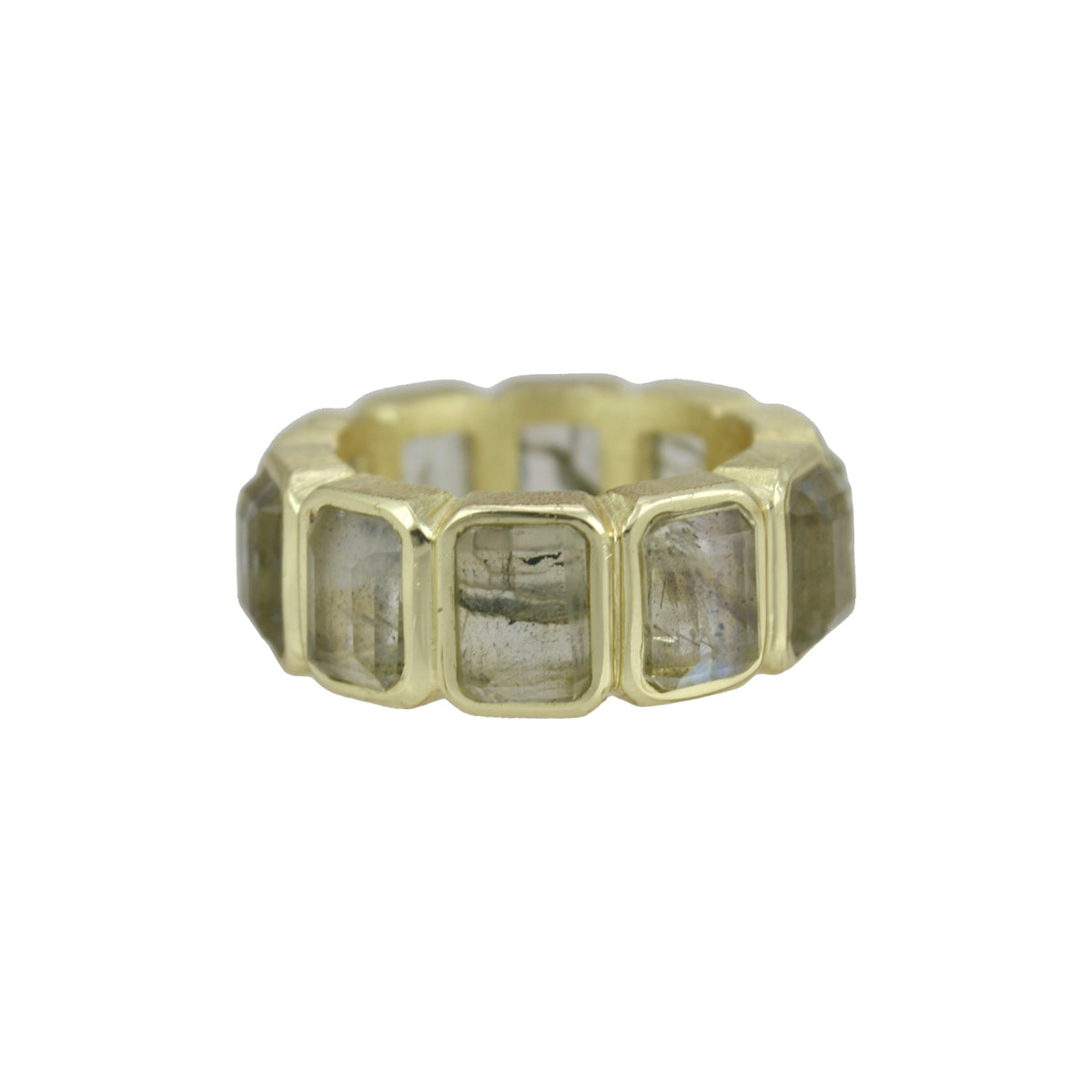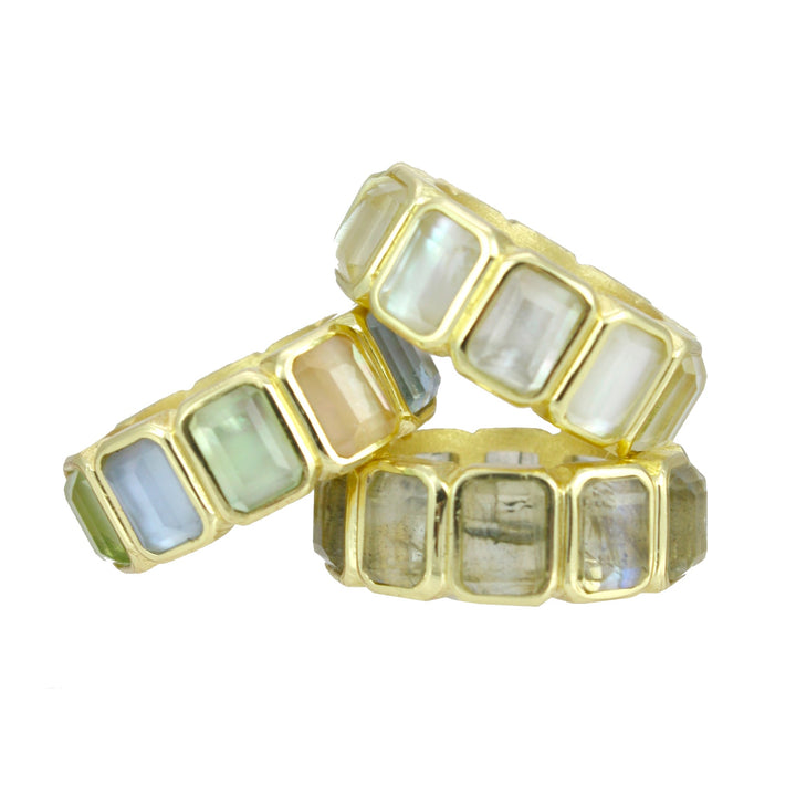 The Kiana Stone Ring by Marcia Moran is an 18k gold-plated ring featuring semi-precious stone duplets all around. Its vibrant colors make it perfect for stacking, adding versatility to your jewelry collection. The design is ideal for layering alongside another Kiana Stone Ring for a bold, playful look. Handmade in Brazil.