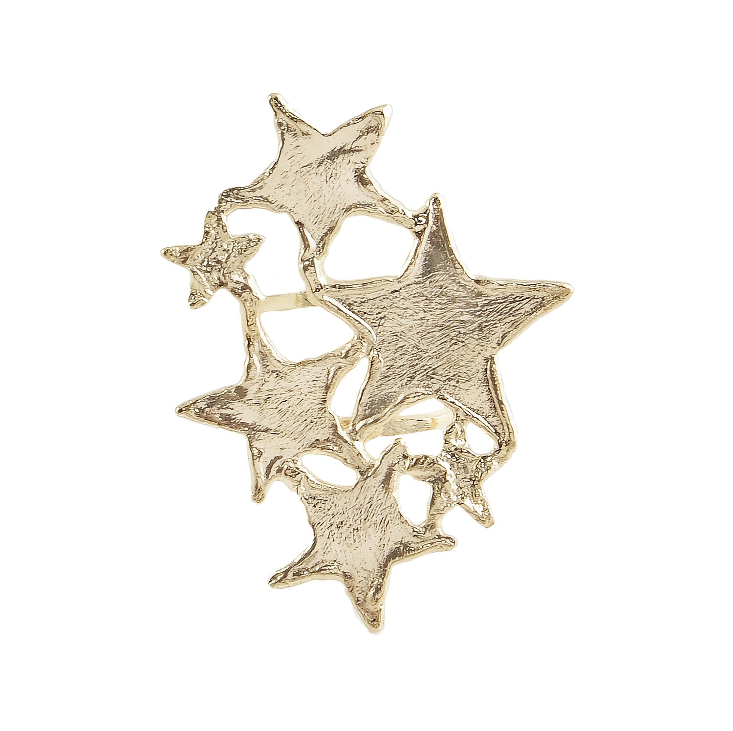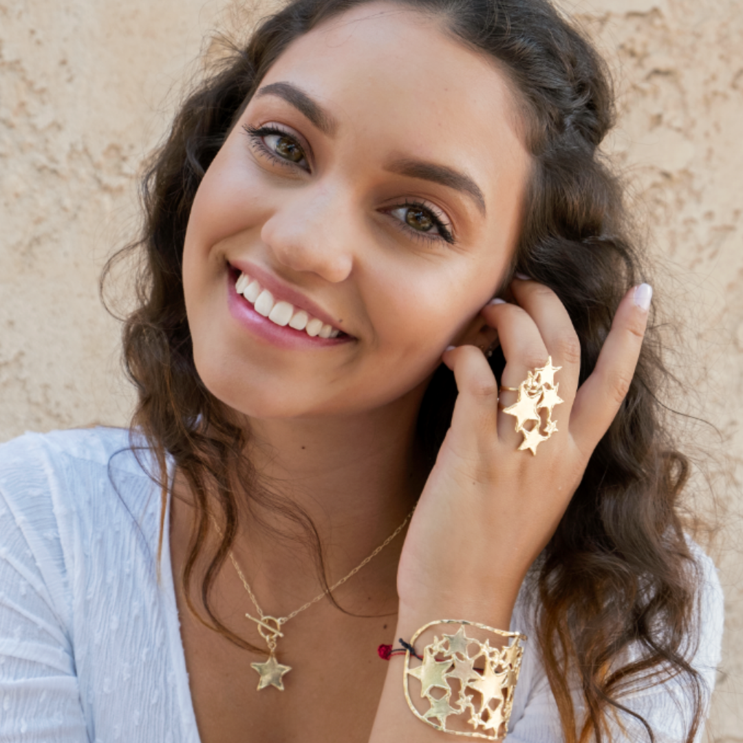 The Simona Star Ring by Marcia Moran from the Star Collection is an 18k gold-plated statement ring adorned with multi-size stars, making it perfect for any occasion. Lightweight, stylish, and hypoallergenic, this piece adds a playful yet elegant touch to any outfit. Handmade in Brazil, the natural semi-precious stones used ensure each piece is unique.