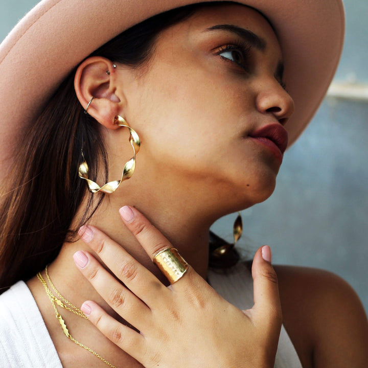 Handcrafted in 18k gold plating with a hammered finish. Adjustable, fitting size 7 and up. Measures 1 inch.