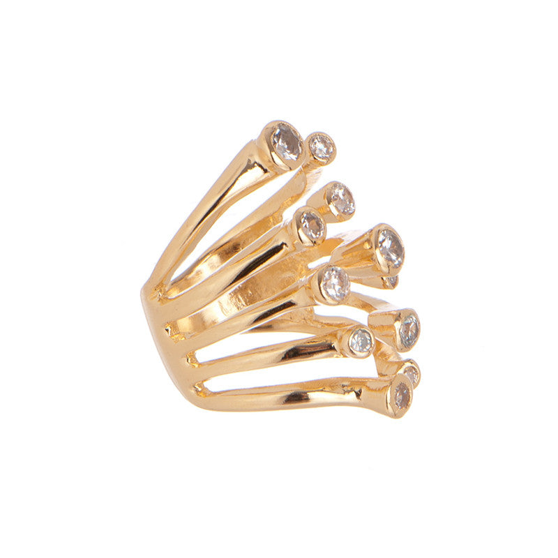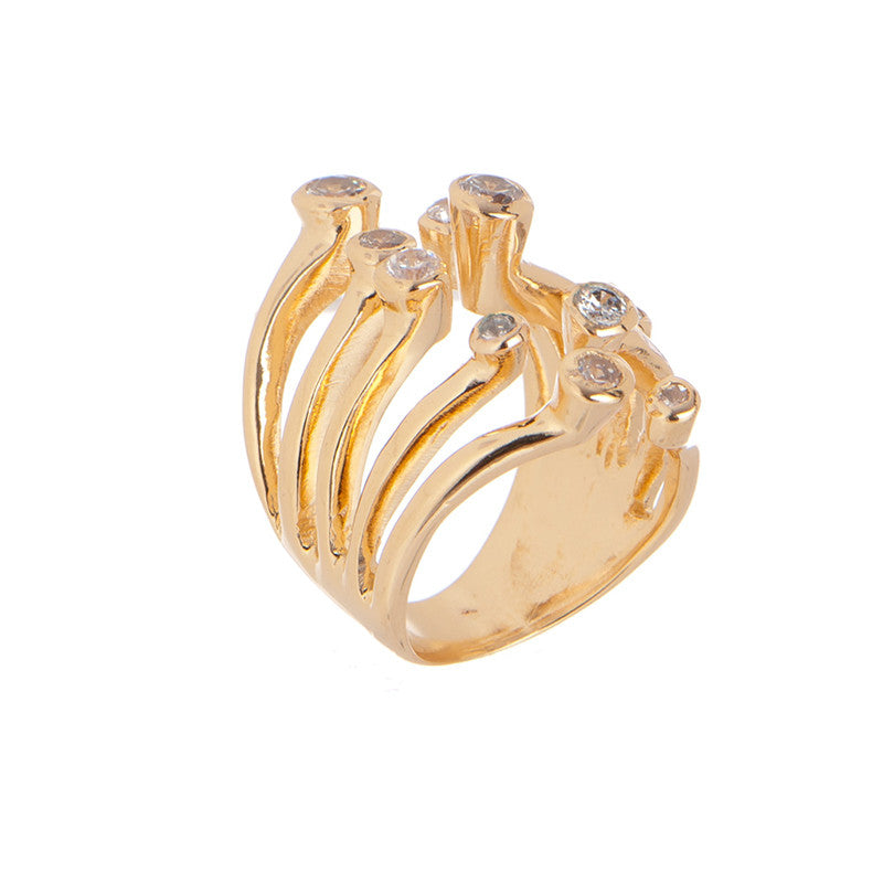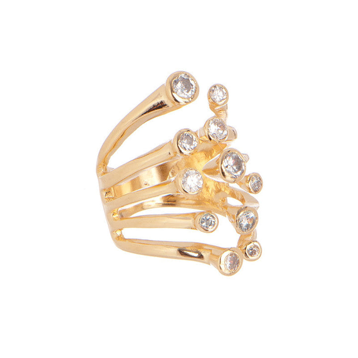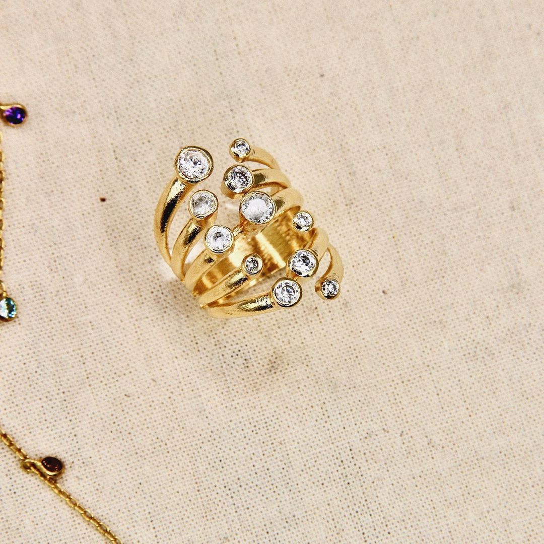 The Galaxy Ring by Marcia Moran features a multi-band design with round-shaped cubic zircons, making it a dazzling statement piece. The 18k gold plating adds a luxurious touch, while the handmade craftsmanship from Brazil ensures unique quality.