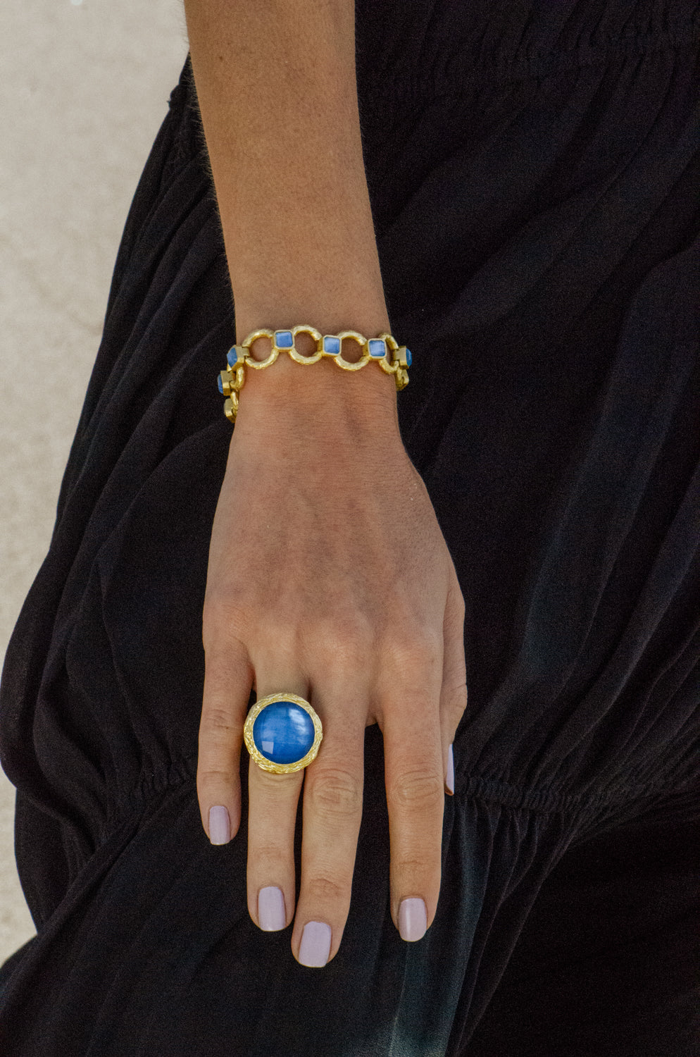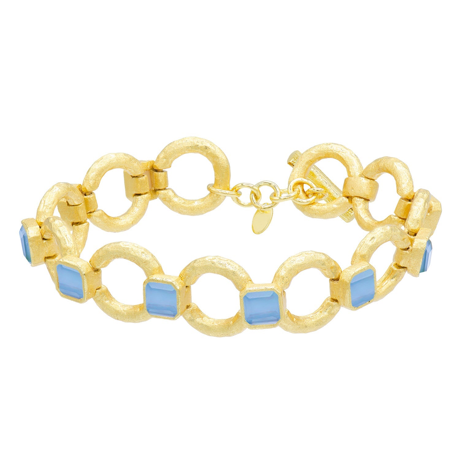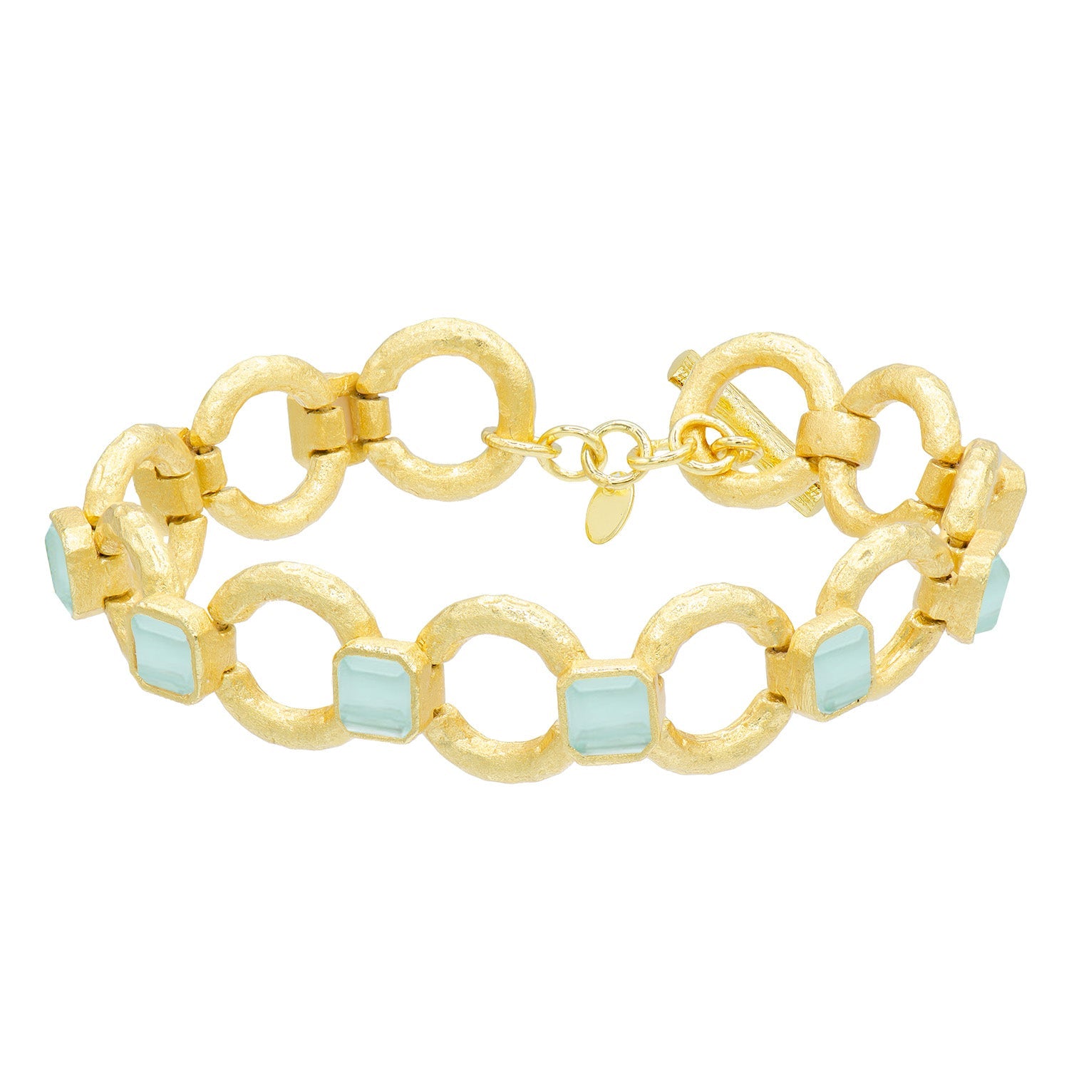 The Ezili Bracelet by Marcia Moran features a hammered chain design with square gemstones and a toggle closure. Crafted with 24k gold plating, it pairs beautifully with the Marina necklace and Doria earrings for a complete look. Handmade in Brazil, this bracelet is a versatile and elegant addition to any collection.
