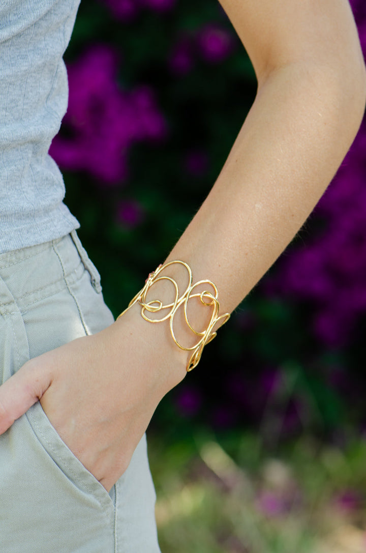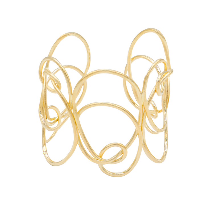 Handcrafted in 18k gold plating with a multi-wire design. Measures 2 inches wide.