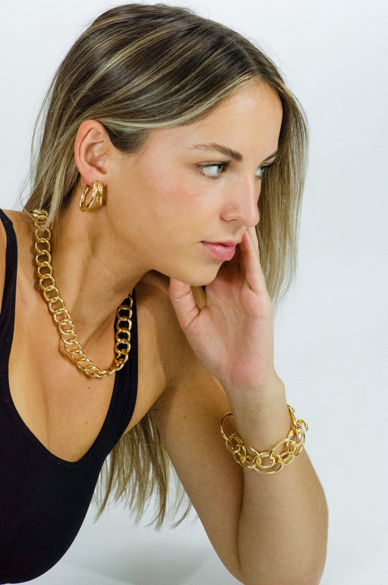 The Gaia Bracelet by Marcia Moran is a bold 18k gold-plated bracelet featuring interlocking oval chains. Its 9-inch length makes it a standout accessory, perfect for adding sophistication to any ensemble. Handmade in Brazil, it offers a luxurious, eye-catching look.
