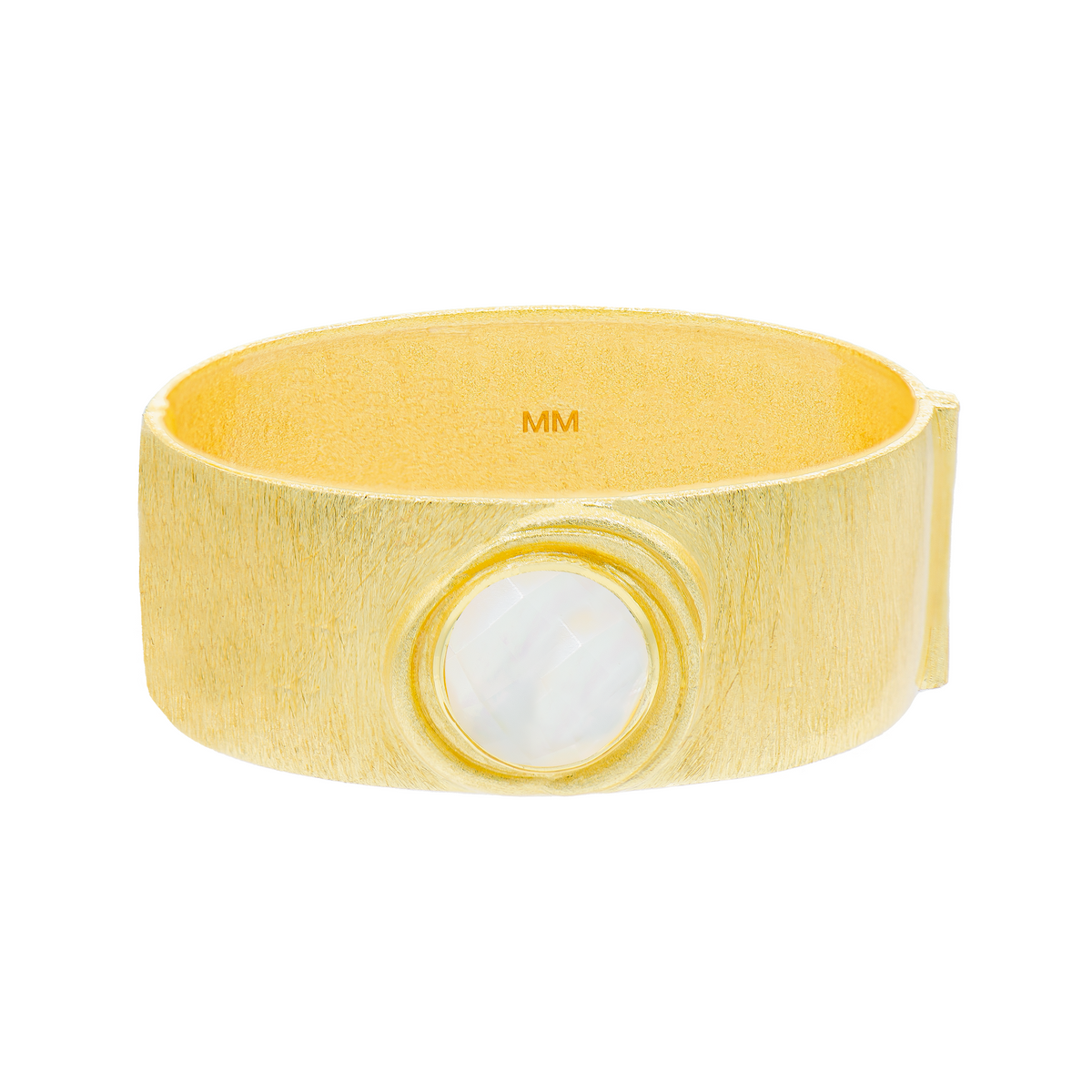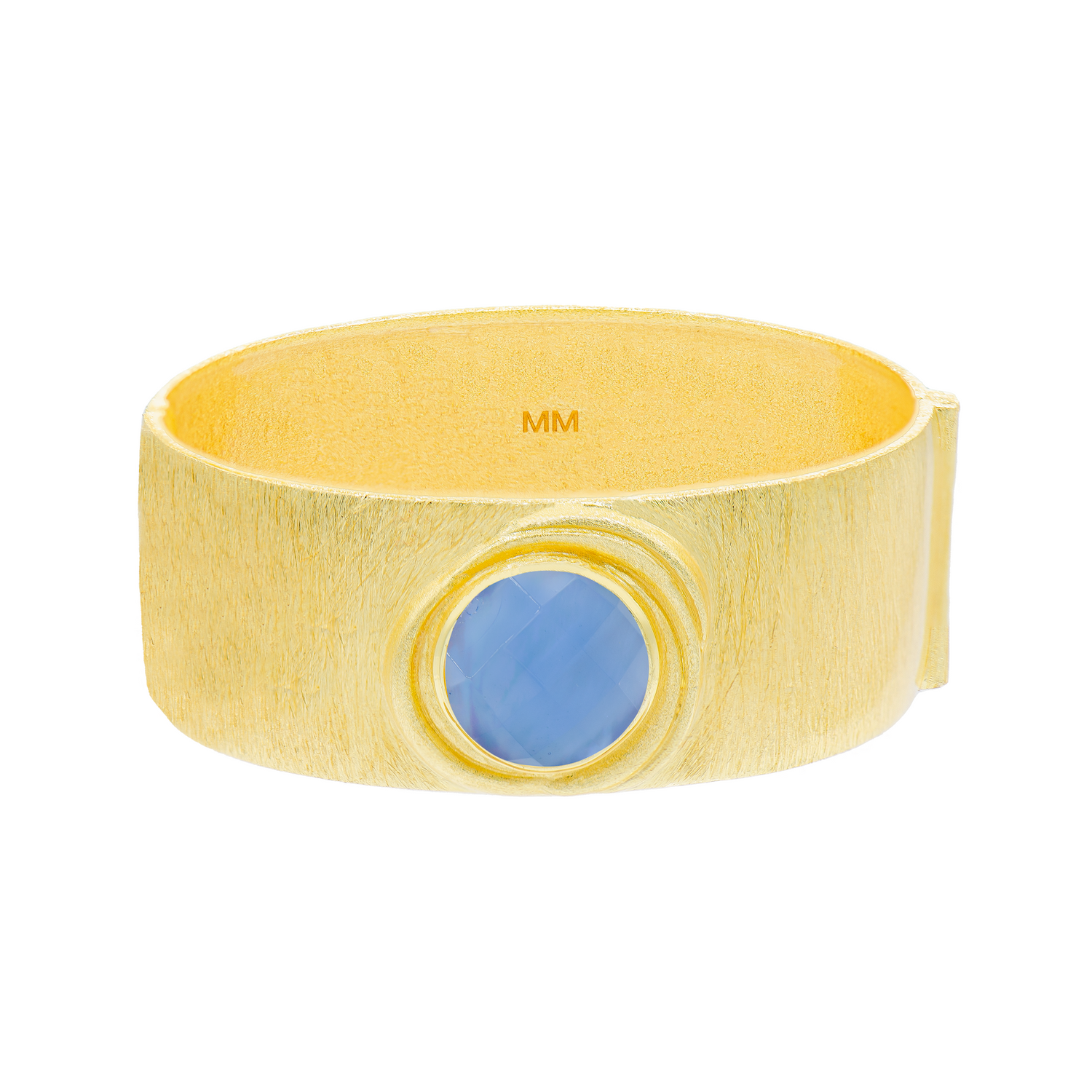 The Rennes Bracelet by Marcia Moran is an elegant 18k gold-plated hinge bracelet with a striking stone center. This sophisticated piece pairs perfectly with the Veria Earrings and Rhys Necklace for a polished, cohesive look. Handmade in Brazil, it features natural semi-precious stones for unique texture and color.