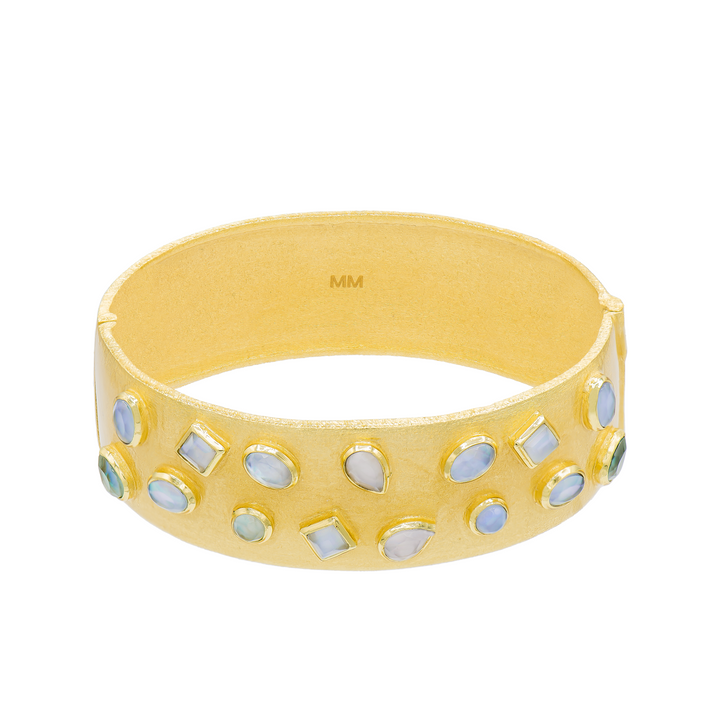 Handcrafted in 18k gold plating with mosaic stones. Measures 2 inches wide with a hinge closure. Each piece is unique due to natural semi-precious stones.
