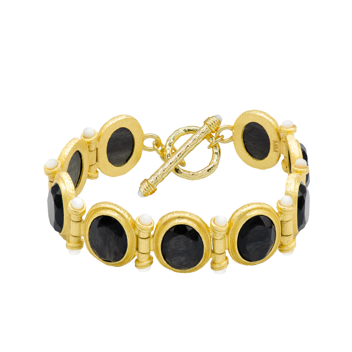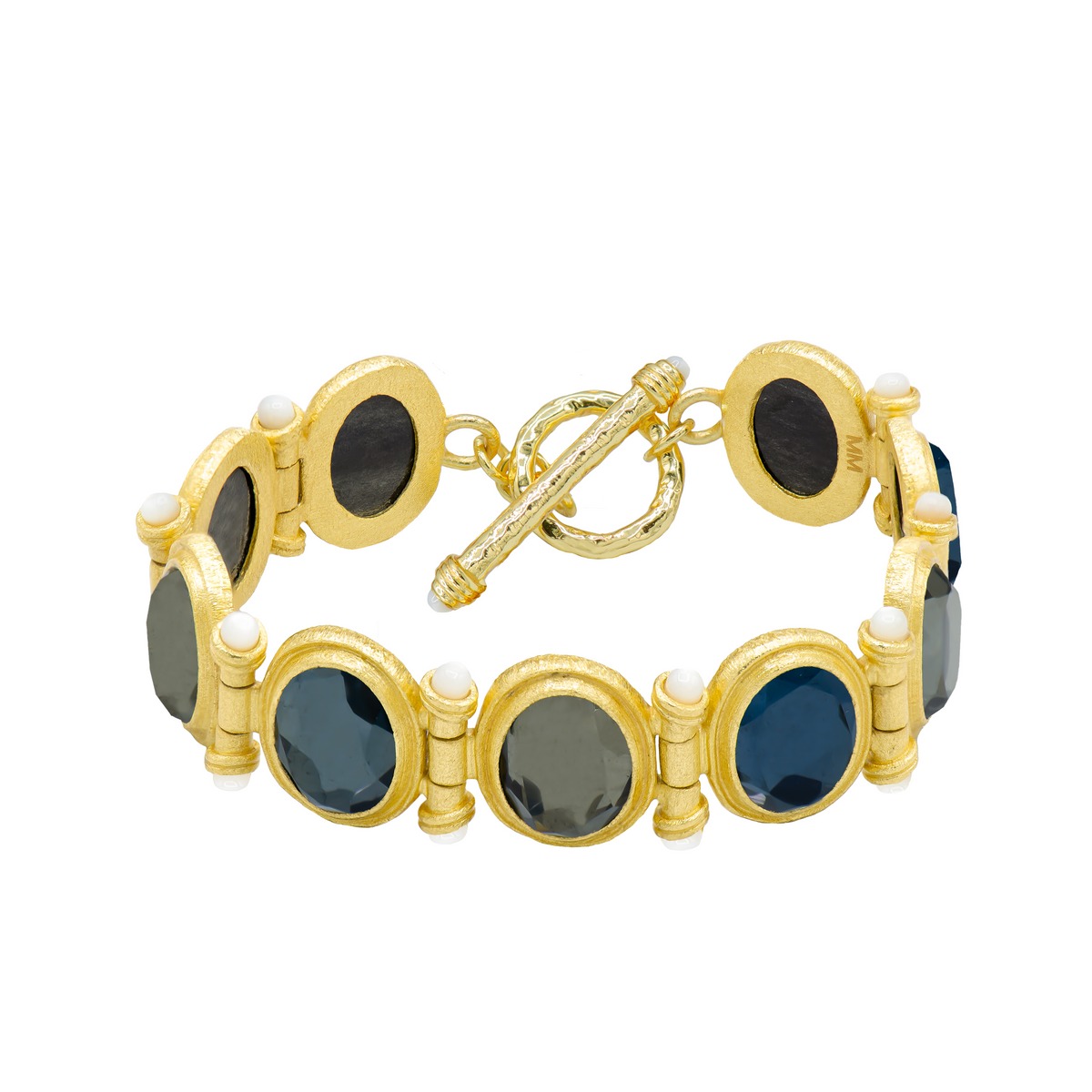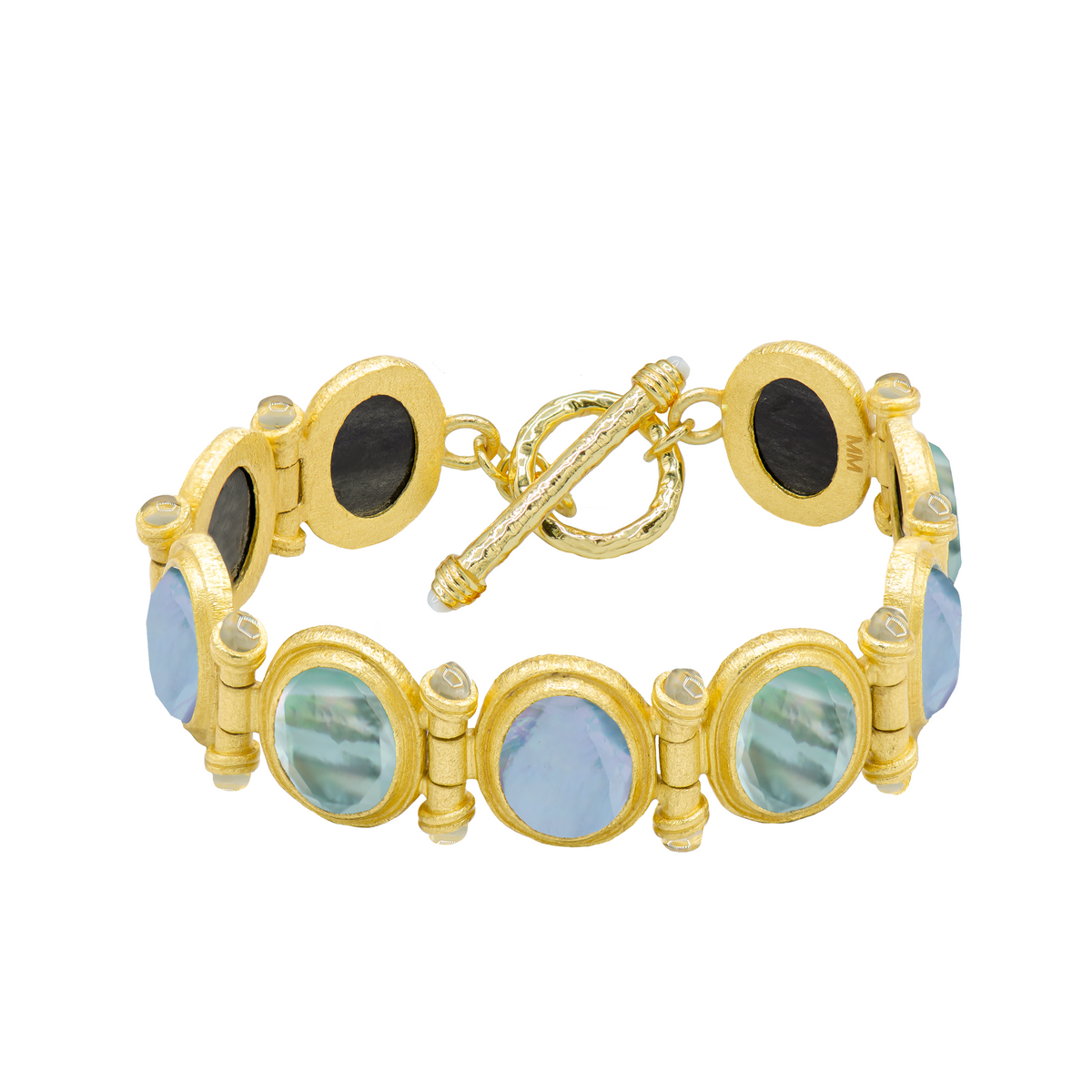 The Lyon Bracelet by Marcia Moran is a luxurious 18k gold-plated design featuring nine faceted gemstone duplets connected with hinges for a sophisticated touch. Pair it with the Giverny Necklace and Bastille Earrings for a statement-making ensemble. Handmade in Brazil, this bracelet is crafted with natural semi-precious stones, giving each piece a unique texture and color.