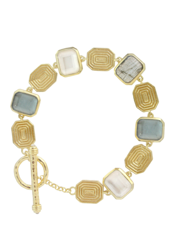 Handcrafted in 18k gold plating with textured hexagon pieces and alternating stones. Measures 7.5 inches long.